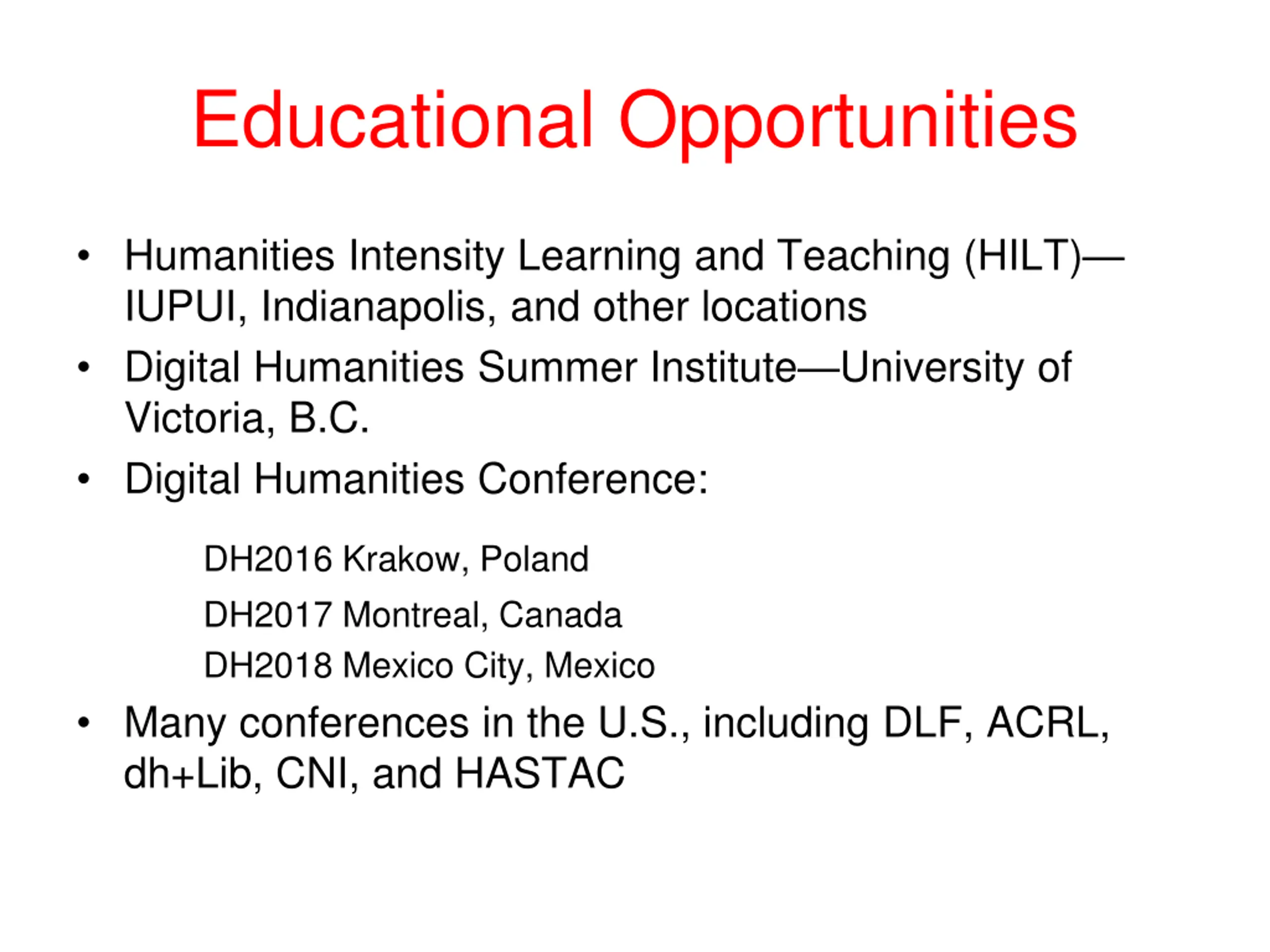 Educational Opportunities Humanities Intensity Learning and Teaching (HILT) IUPUI, Indianapolis, and other locations Digital Humanities Summer Institute University of Victoria, B.C. Digital Humanities Conference: DH2016 Krakow, Poland DH2017 Montreal, Canada DH2018 Mexico City, Mexico Many conferences in the U.S., including DLF, ACRL, dh+Lib, CNI, and HASTAC