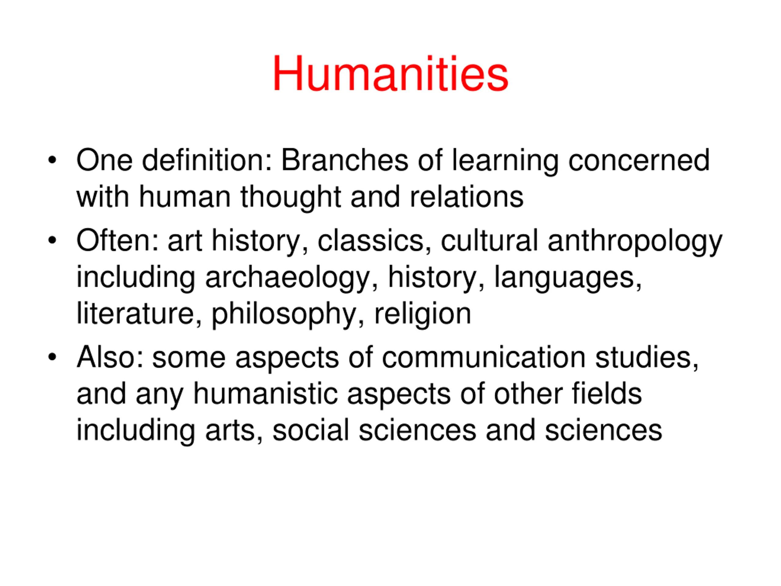 Humanities One definition: Branches of learning concerned with human thought and relations Often: art history, classics, cultural anthropology including archaeology, history, languages, literature, philosophy, religion Also: some aspects of communication studies, and any humanistic aspects of other fields including arts, social sciences and sciences