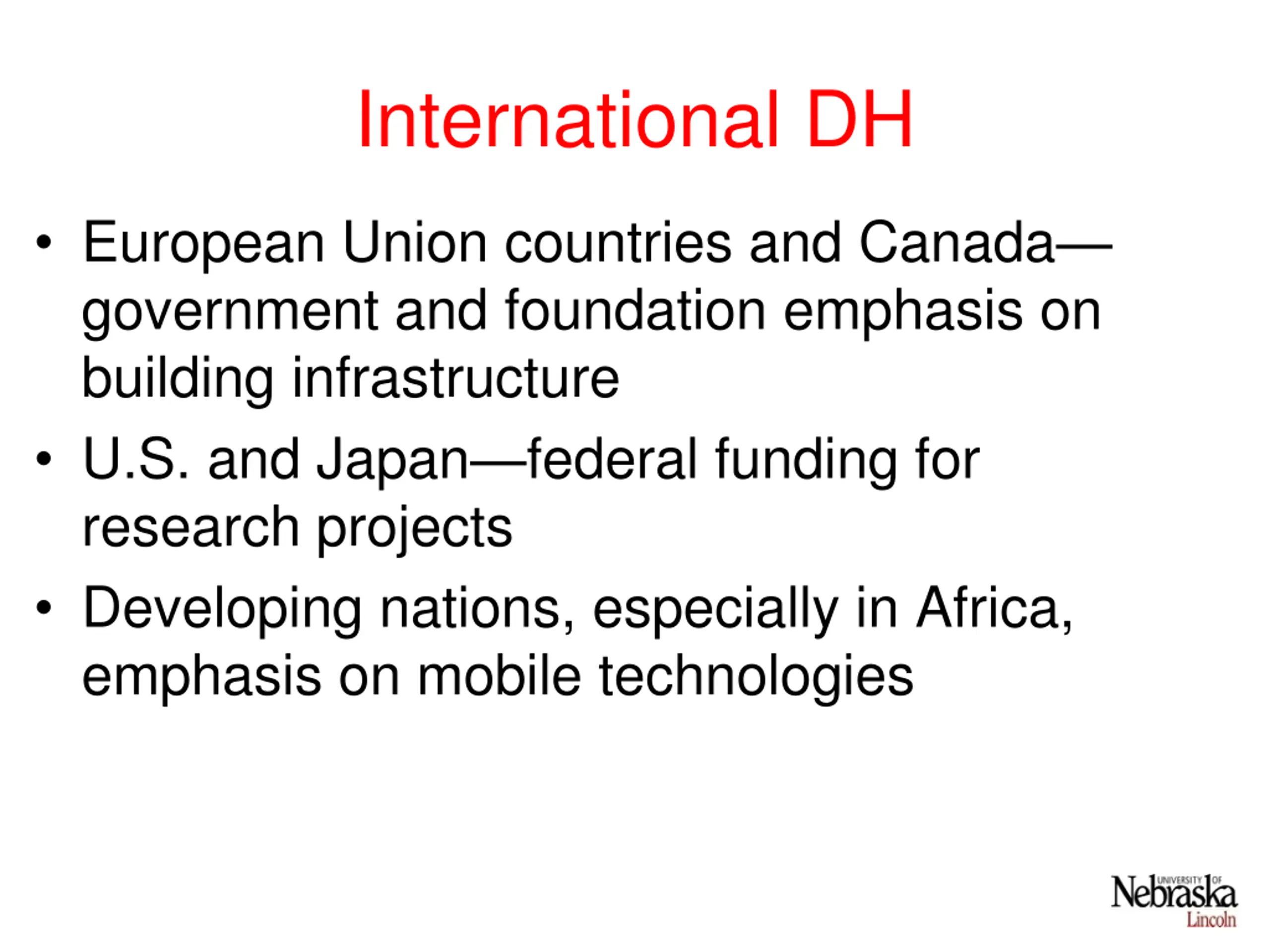 International DH European Union countries and Canada government and foundation emphasis on building infrastructure U.S. and Japan federal funding for research projects Developing nations, especially in Africa, emphasis on mobile technologies