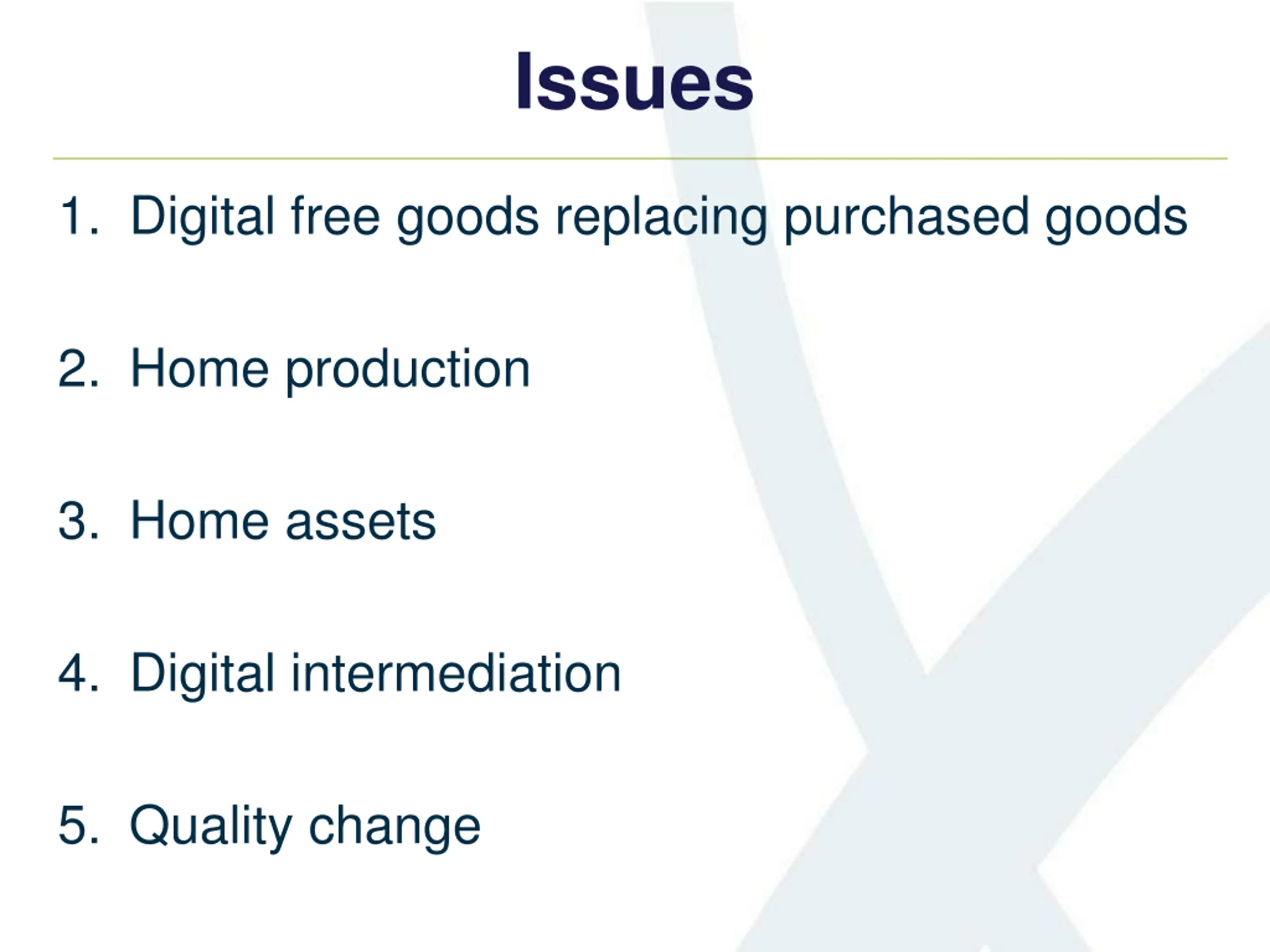 Issues 1. Digital free goods replacing purchased goods 2. Home production 3. Home assets 4. Digital intermediation 5. Quality change