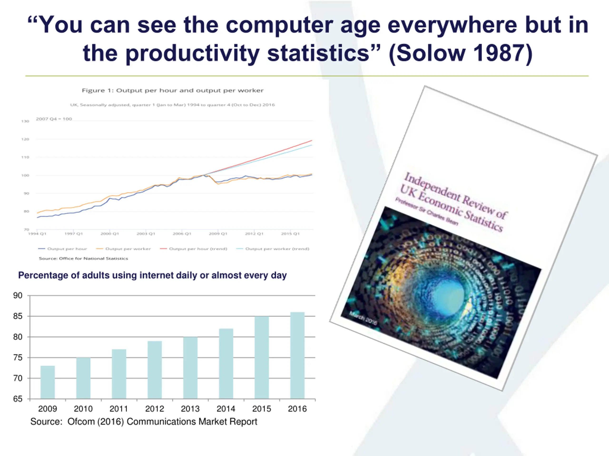 You can see the computer age everywhere but in the productivity statistics (Solow 1987) Percentage of adults using internet daily or almost every day 90 85 80 75 70 65 2009 Source: Ofcom (2016) Communications Market Report 2010 2011 2012 2013 2014 2015 2016
