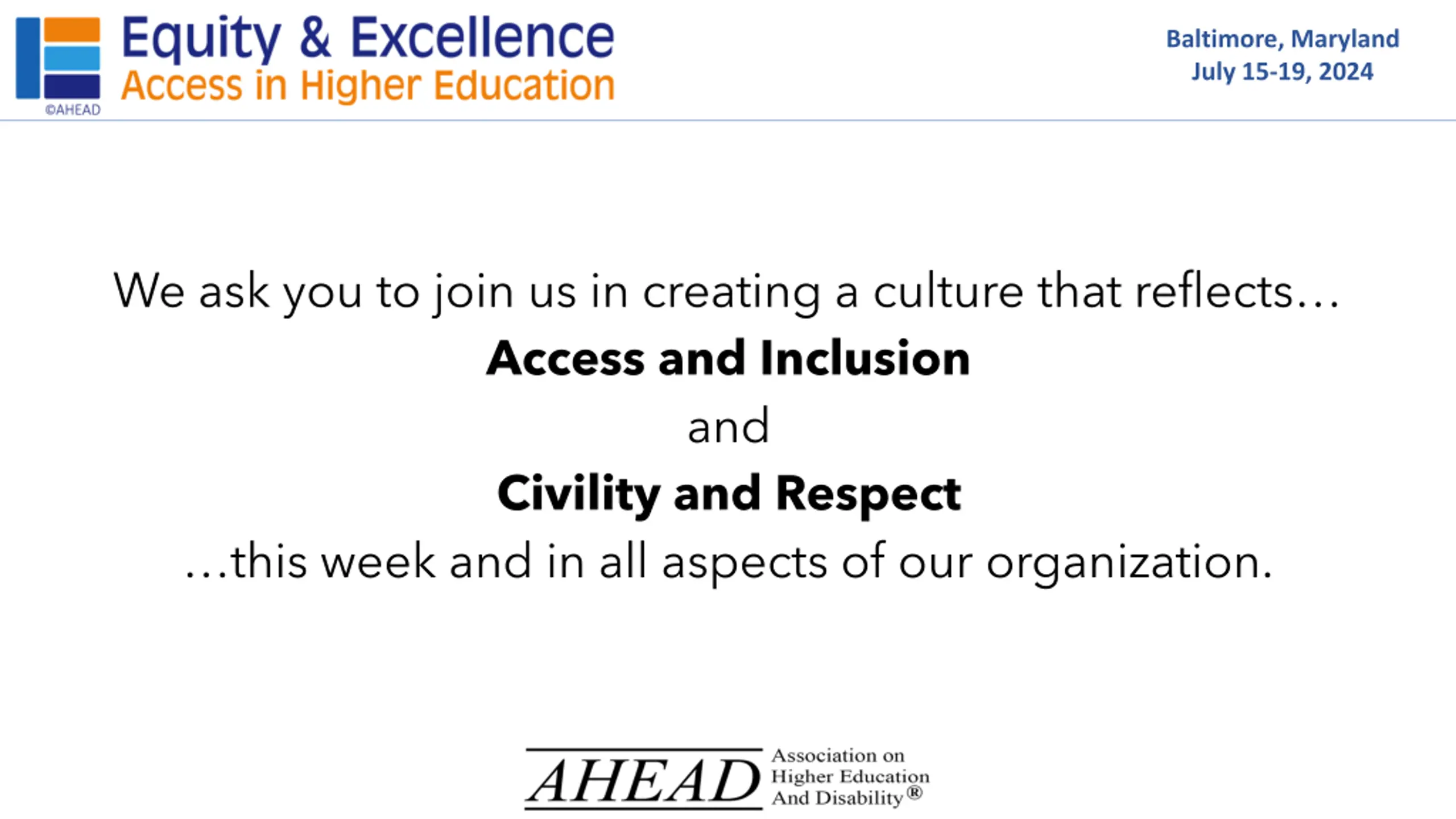 Baltimore, Maryland July 15-19, 2024 Conference Civility Statement We ask you to join us in creating a culture that reflects Access and Inclusion and Civility and Respect this week and in all aspects of our organization.
