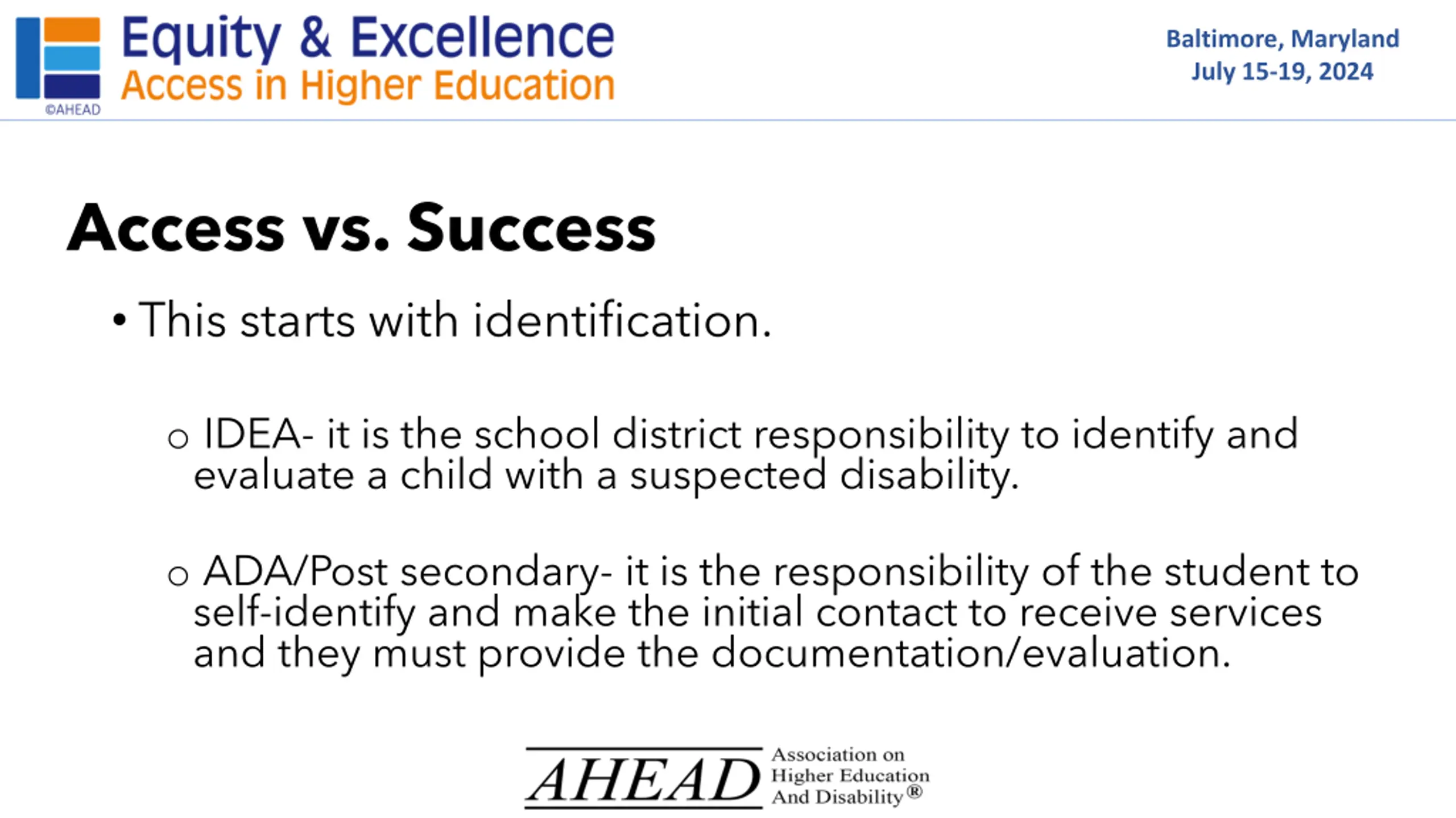Baltimore, Maryland July 15-19, 2024 Access vs. Success This starts with identification. o IDEA- it is the school district responsibility to identify and evaluate a child with a suspected disability. o ADA/Post secondary- it is the responsibility of the student to self-identify and make the initial contact to receive services and they must provide the documentation/evaluation.