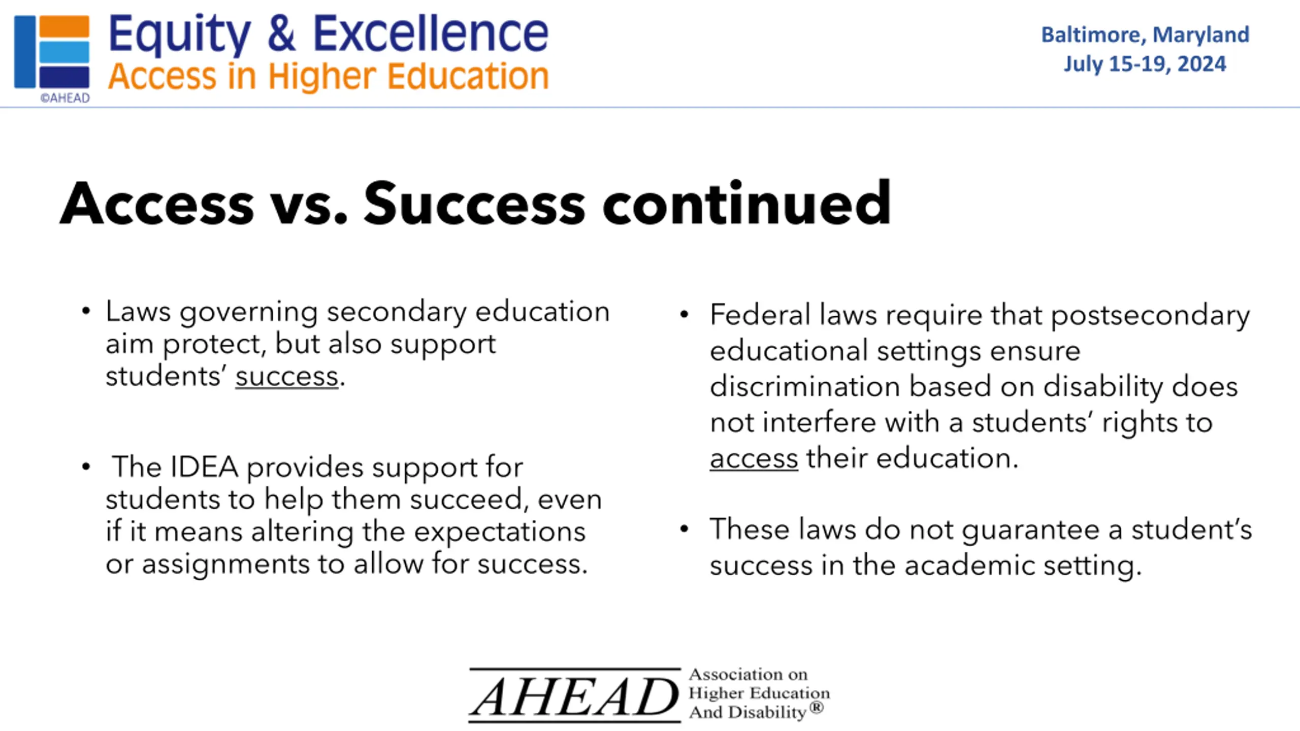 Baltimore, Maryland July 15-19, 2024 Access vs. Success continued Laws governing secondary education aim protect, but also support students success. Federal laws require that postsecondary educational settings ensure discrimination based on disability does not interfere with a students rights to access their education. The IDEA provides support for students to help them succeed, even if it means altering the expectations or assignments to allow for success. These laws do not guarantee a student s success in the academic setting.