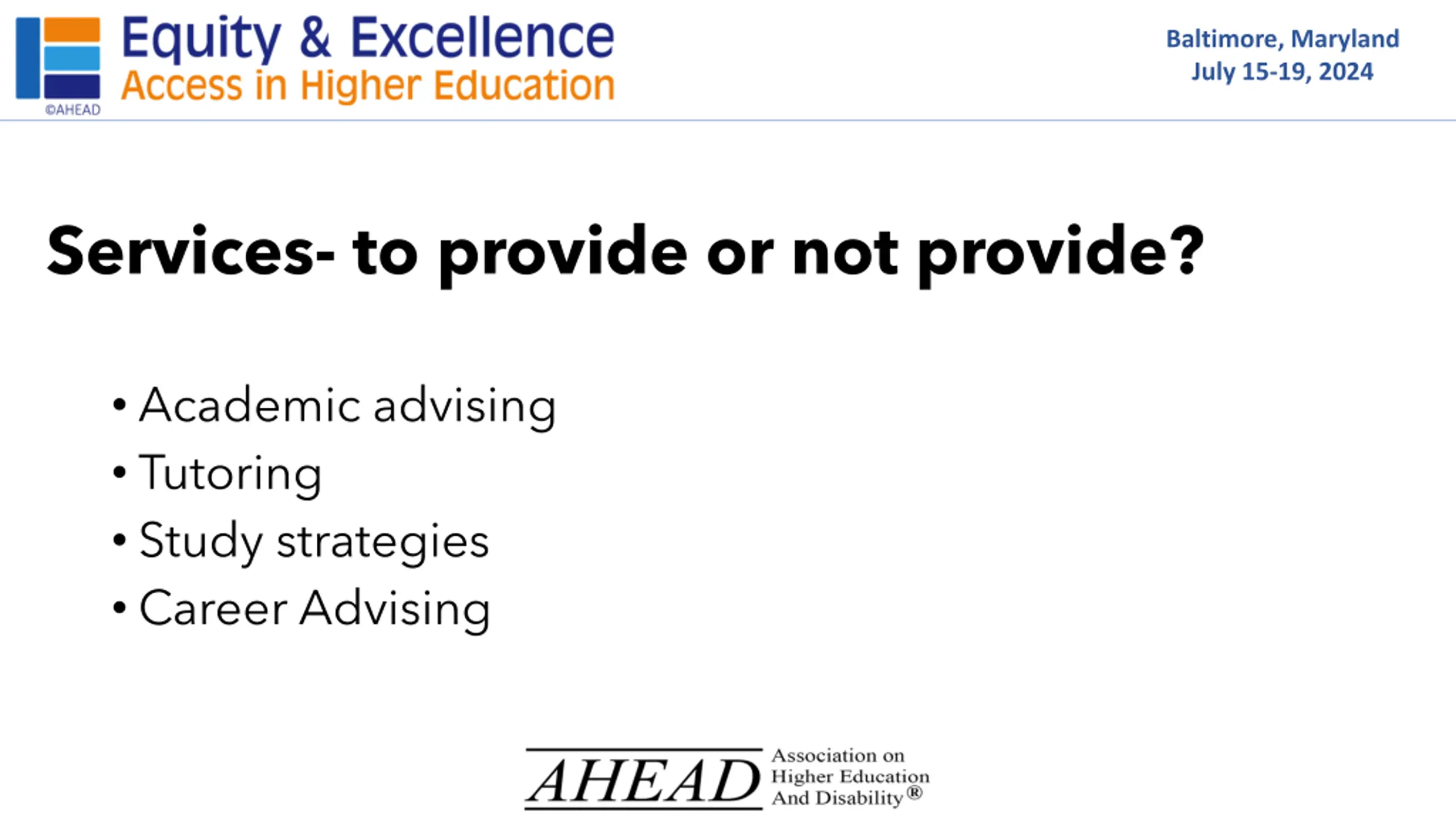 Baltimore, Maryland July 15-19, 2024 Services- to provide or not provide? Academic advising Tutoring Study strategies Career Advising