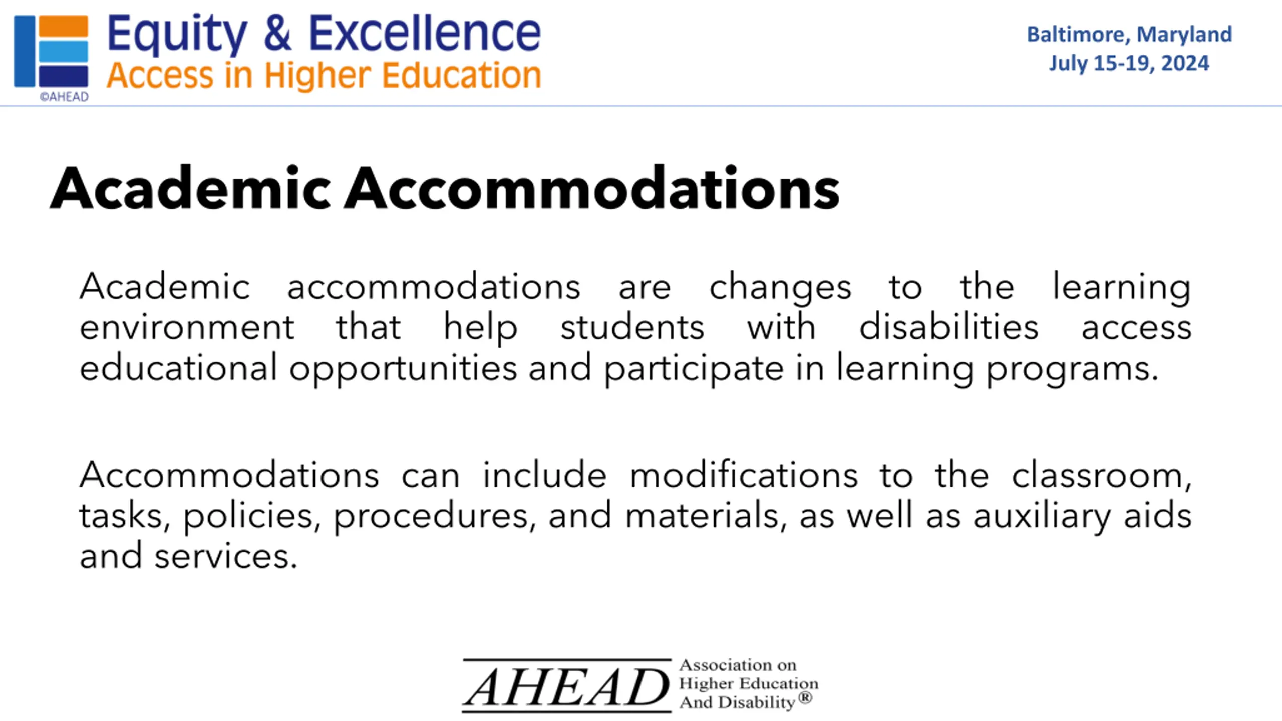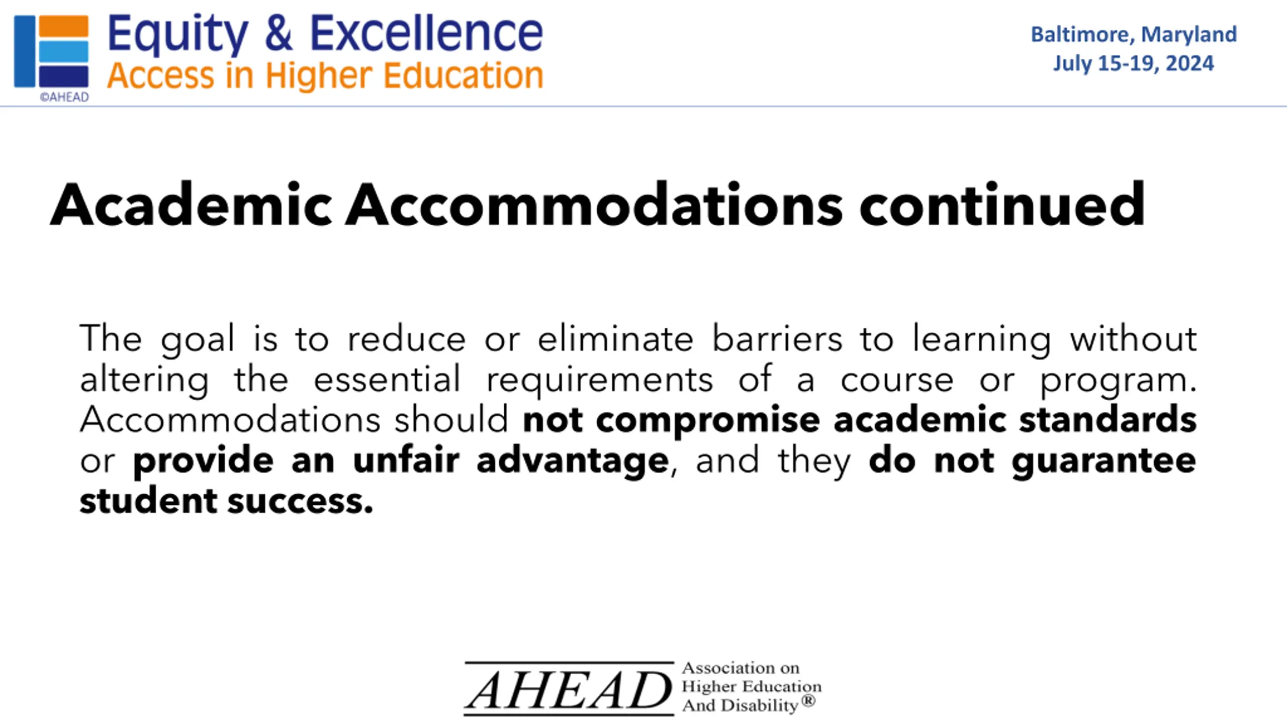 Baltimore, Maryland July 15-19, 2024 Academic Accommodations continued The goal is to reduce or eliminate barriers to learning without altering the essential requirements of a course or program. Accommodations should not compromise academic standards or provide an unfair advantage, and they do not guarantee student success.