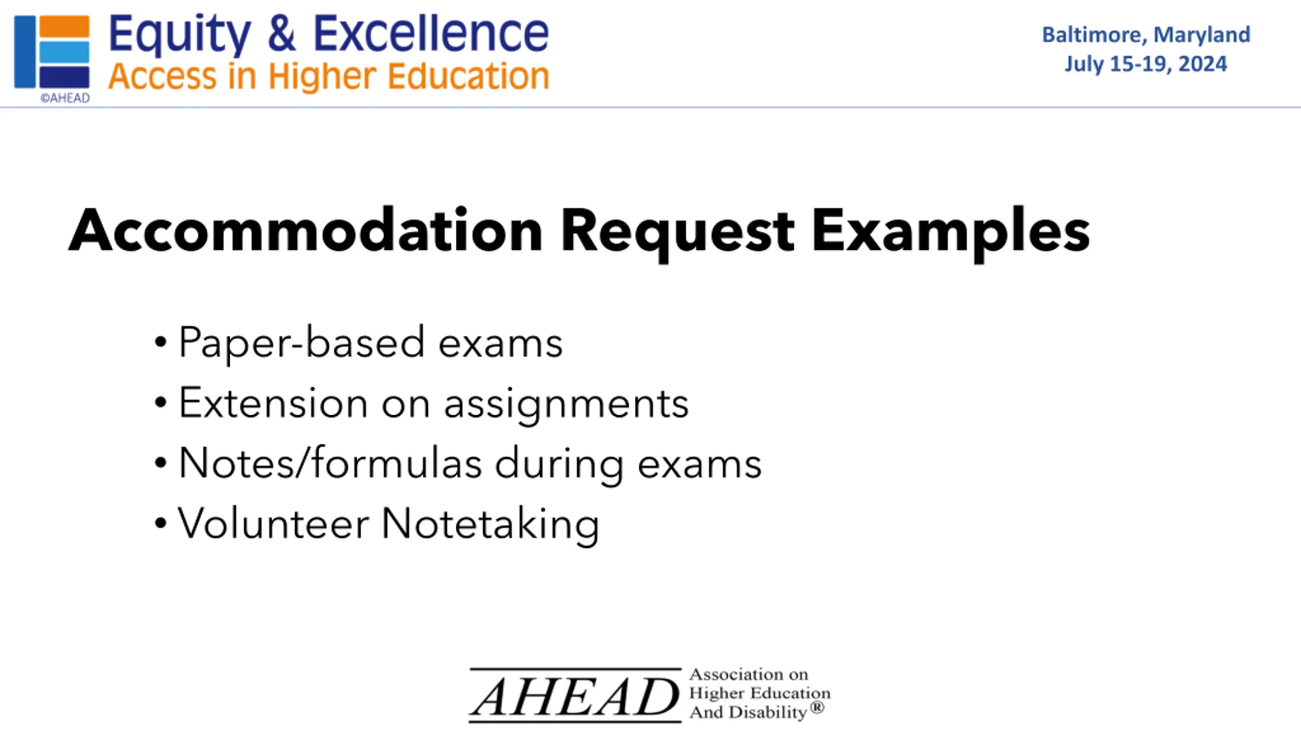 Baltimore, Maryland July 15-19, 2024 Accommodation Request Examples Paper-based exams Extension on assignments Notes/formulas during exams Volunteer Notetaking