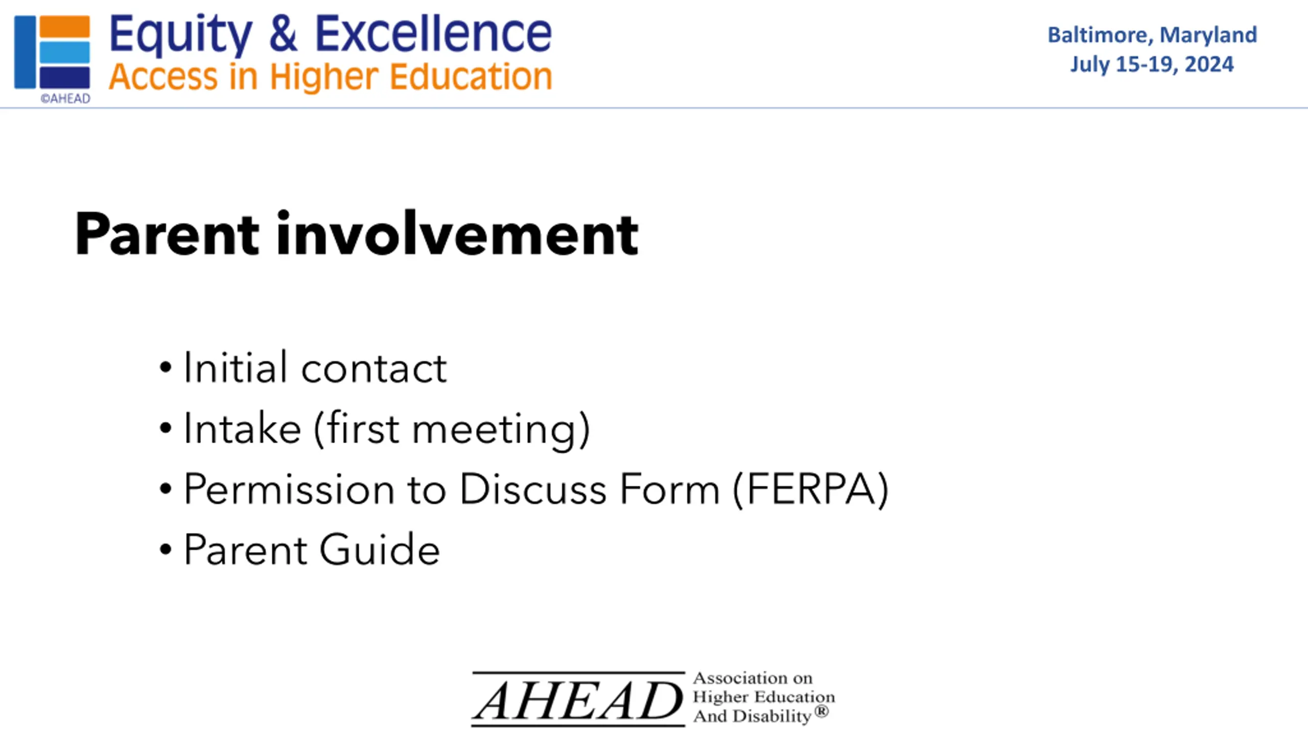 Baltimore, Maryland July 15-19, 2024 Parent involvement Initial contact Intake (first meeting) Permission to Discuss Form (FERPA) Parent Guide