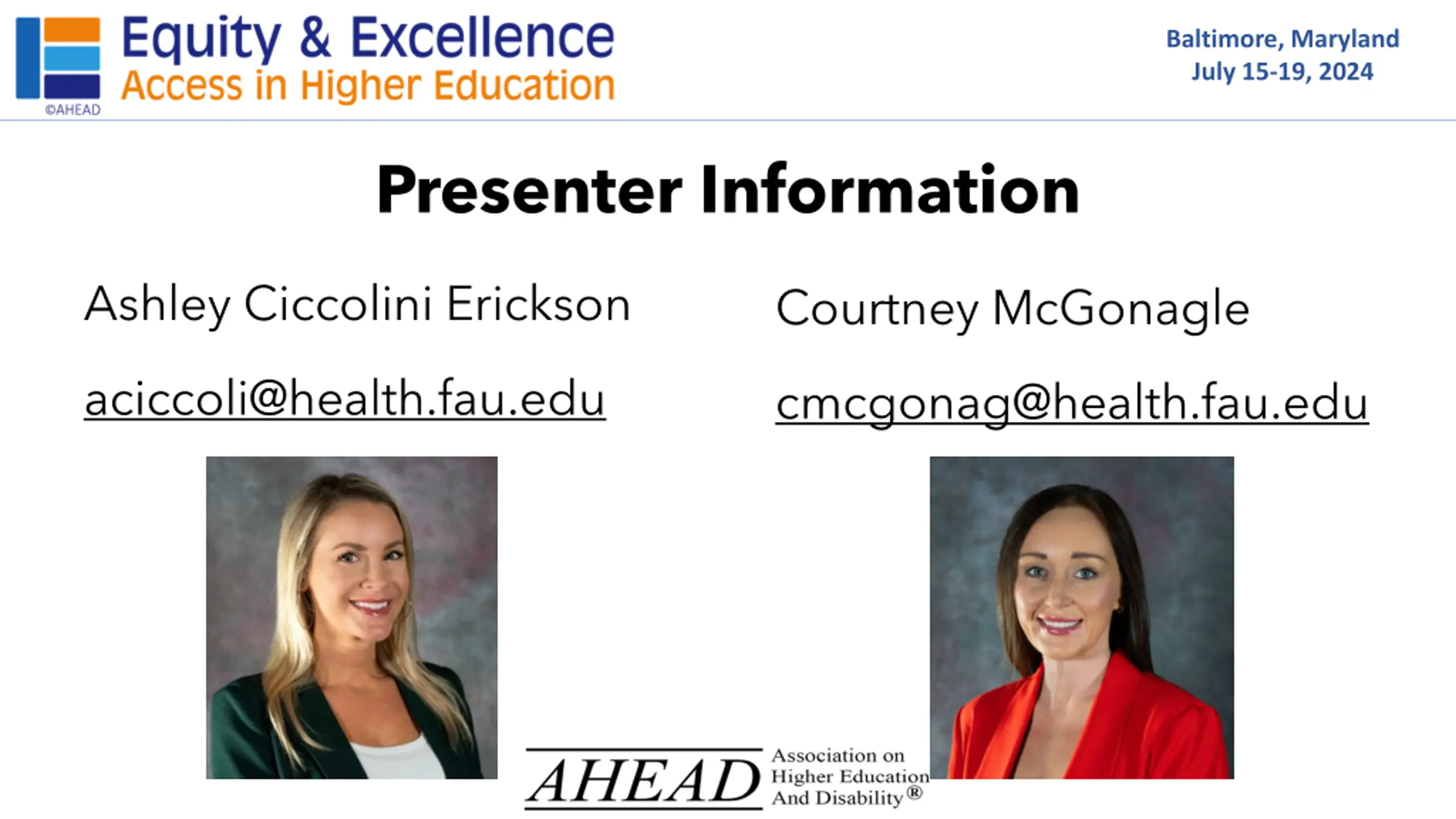 Baltimore, Maryland July 15-19, 2024 Presenter Information Ashley Ciccolini Erickson Courtney McGonagle aciccoli@health.fau.edu cmcgonag@health.fau.edu