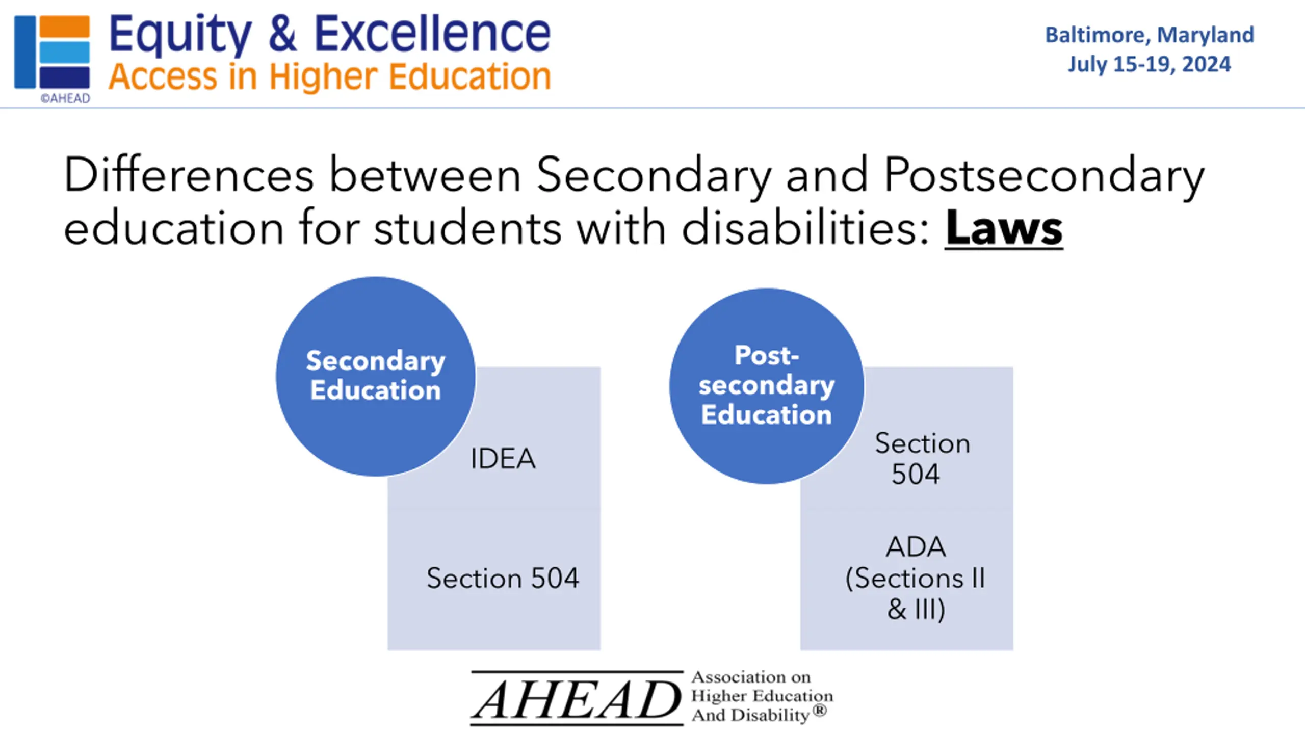 Baltimore, Maryland July 15-19, 2024 Differences between Secondary and Postsecondary education for students with disabilities: Laws Post- secondary Education Secondary Education Section 504 IDEA ADA (Sections II & III) Section 504