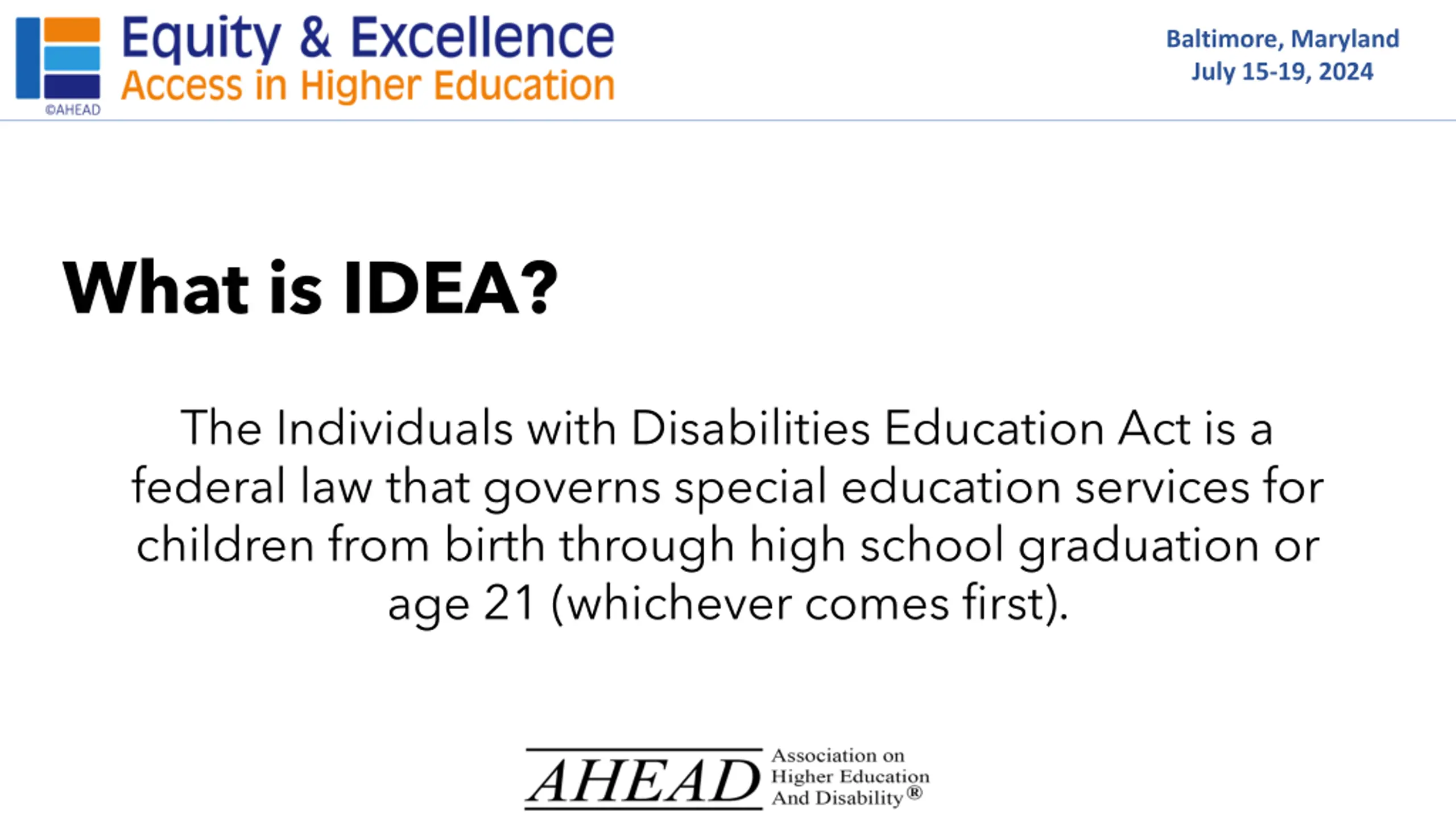 Baltimore, Maryland July 15-19, 2024 What is IDEA? The Individuals with Disabilities Education Act is a federal law that governs special education services for children from birth through high school graduation or age 21 (whichever comes first).