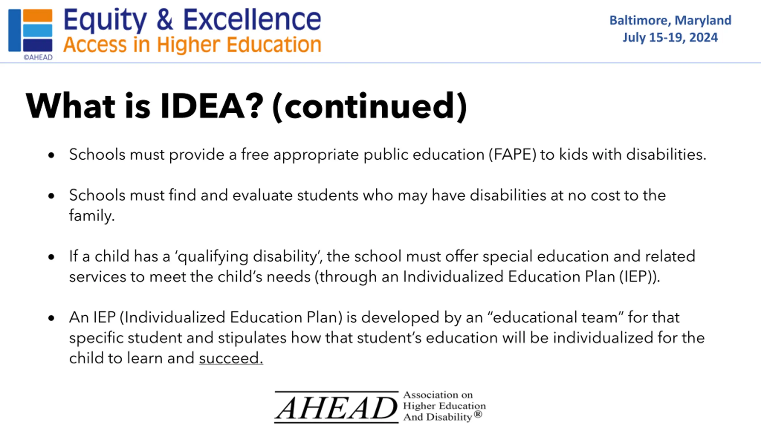 Baltimore, Maryland July 15-19, 2024 What is IDEA? (continued) Schools must provide a free appropriate public education (FAPE) to kids with disabilities. Schools must find and evaluate students who may have disabilities at no cost to the family. If a child has a qualifying disability , the school must offer special education and related services to meet the child s needs (through an Individualized Education Plan (IEP)). An IEP (Individualized Education Plan) is developed by an educational team for that specific student and stipulates how that student s education will be individualized for the child to learn and succeed.