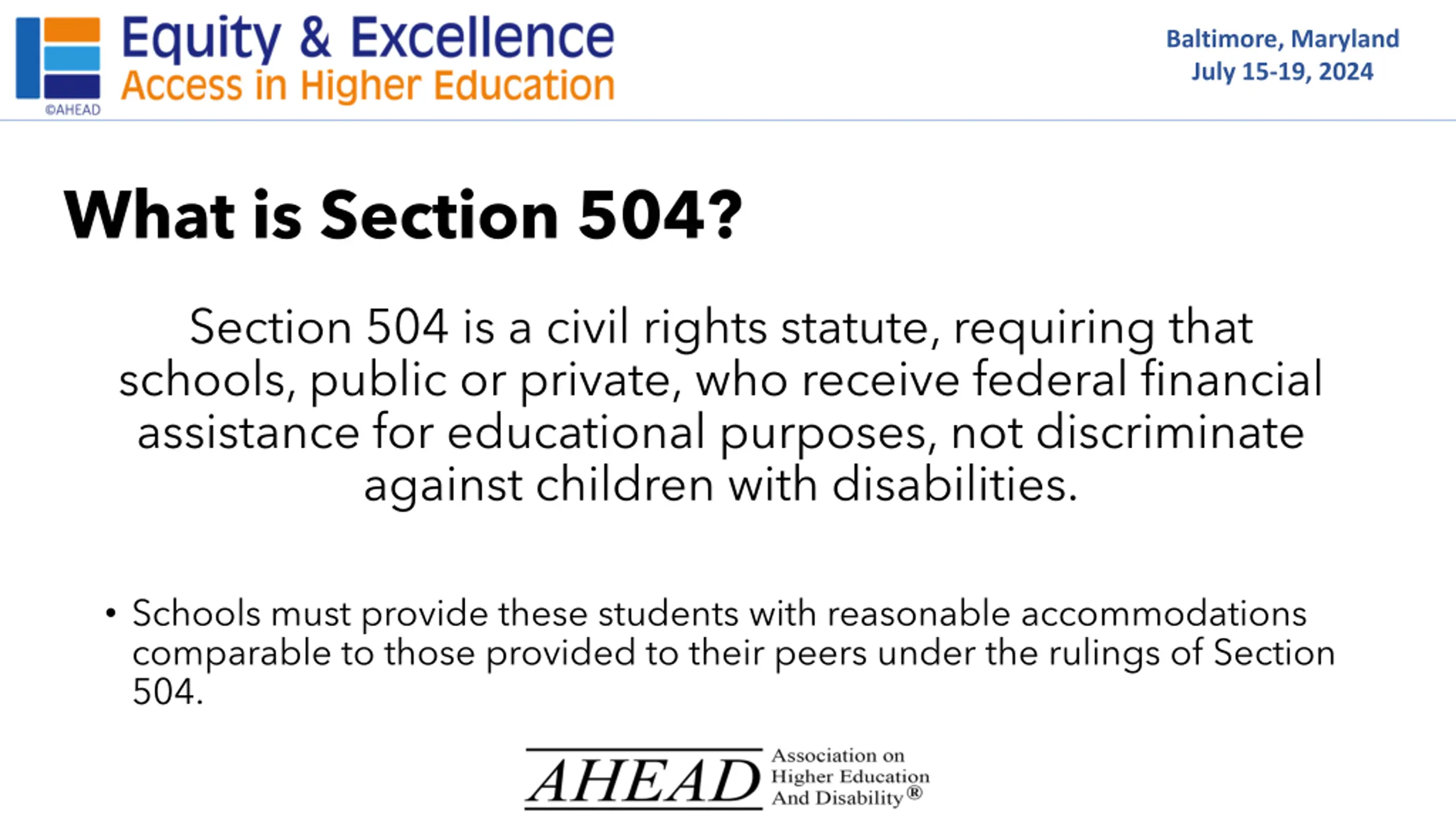 Baltimore, Maryland July 15-19, 2024 What is Section 504? Section 504 is a civil rights statute, requiring that schools, public or private, who receive federal financial assistance for educational purposes, not discriminate against children with disabilities. Schools must provide these students with reasonable accommodations comparable to those provided to their peers under the rulings of Section 504.