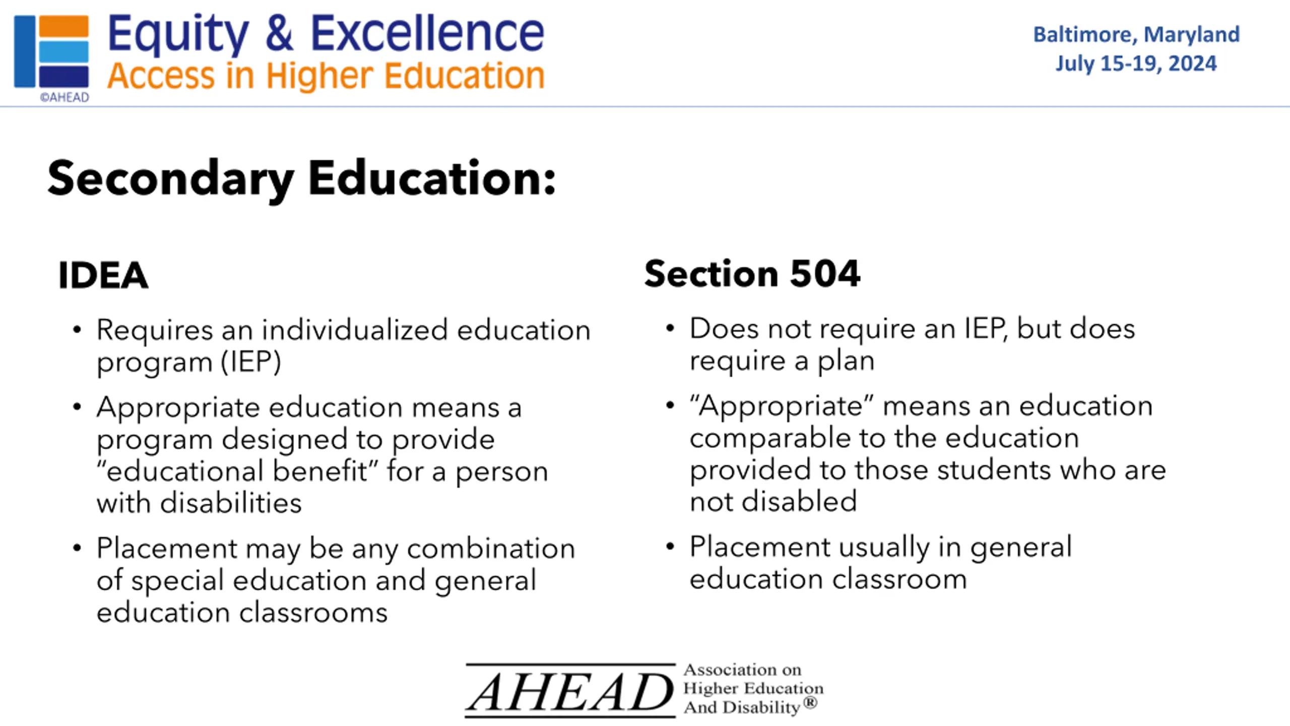 Baltimore, Maryland July 15-19, 2024 Secondary Education: Section 504 Does not require an IEP, but does require a plan Appropriate means an education comparable to the education provided to those students who are not disabled Placement usually in general education classroom IDEA Requires an individualized education program (IEP) Appropriate education means a program designed to provide educational benefit for a person with disabilities Placement may be any combination of special education and general education classrooms