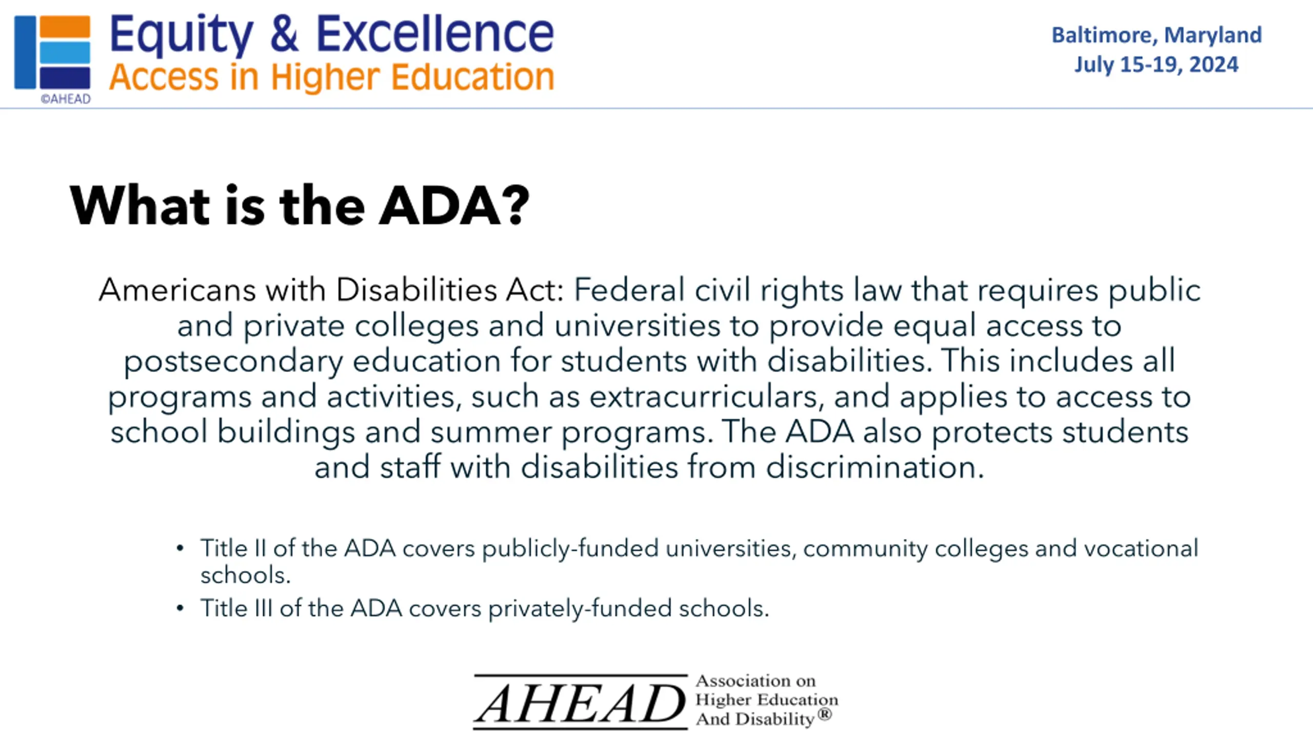 Baltimore, Maryland July 15-19, 2024 What is the ADA? Americans with Disabilities Act: Federal civil rights law that requires public and private colleges and universities to provide equal access to postsecondary education for students with disabilities. This includes all programs and activities, such as extracurriculars, and applies to access to school buildings and summer programs. The ADA also protects students and staff with disabilities from discrimination. Title II of the ADA covers publicly-funded universities, community colleges and vocational schools. Title III of the ADA covers privately-funded schools.
