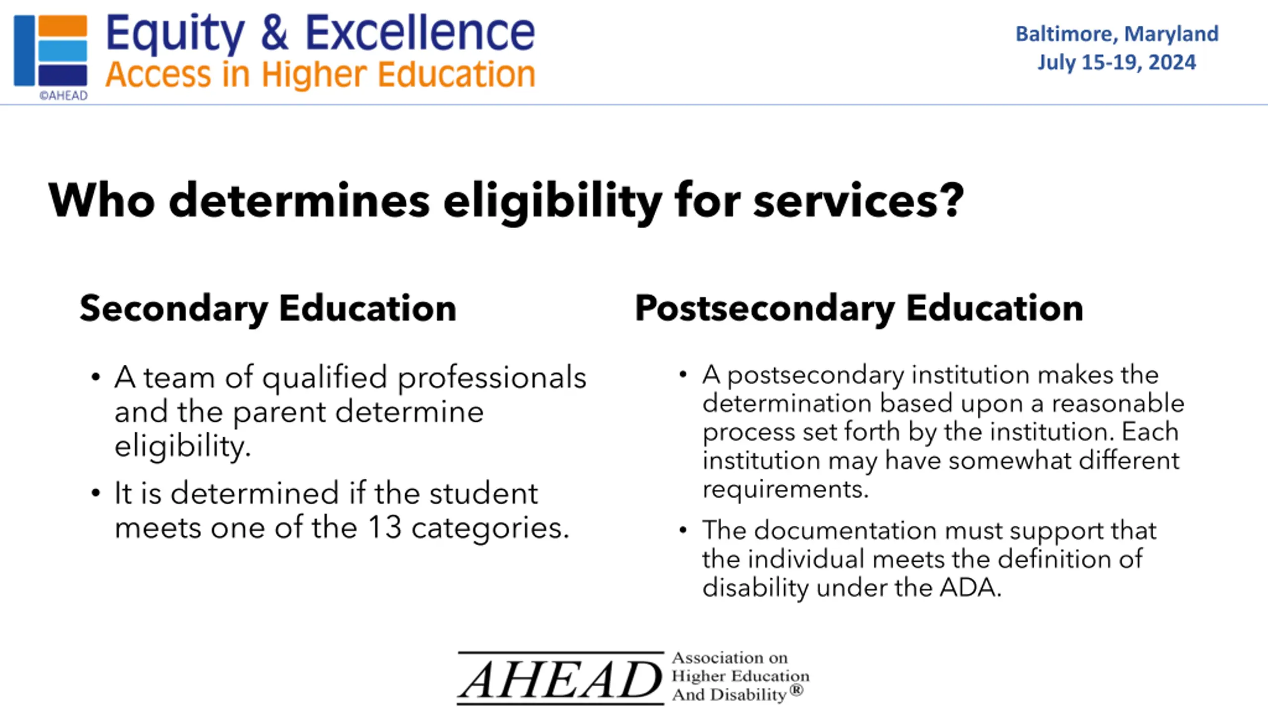 Baltimore, Maryland July 15-19, 2024 Who determines eligibility for services? Postsecondary Education Secondary Education A team of qualified professionals and the parent determine eligibility. It is determined if the student meets one of the 13 categories. A postsecondary institution makes the determination based upon a reasonable process set forth by the institution. Each institution may have somewhat different requirements. The documentation must support that the individual meets the definition of disability under the ADA.