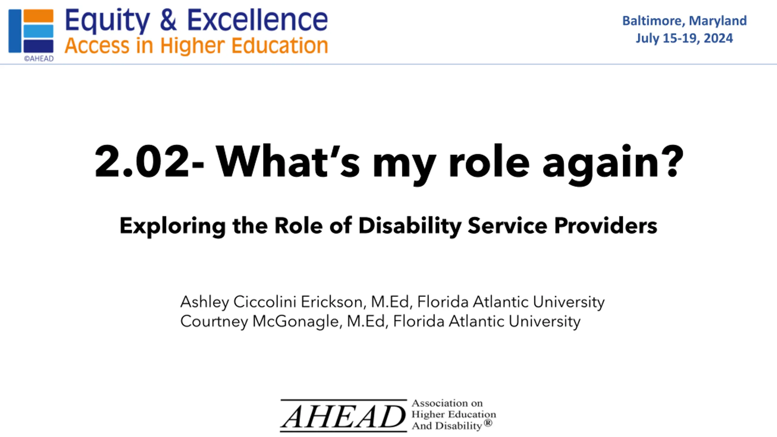 Baltimore, Maryland July 15-19, 2024 2.02- What s my role again? Exploring the Role of Disability Service Providers Ashley Ciccolini Erickson, M.Ed, Florida Atlantic University Courtney McGonagle, M.Ed, Florida Atlantic University
