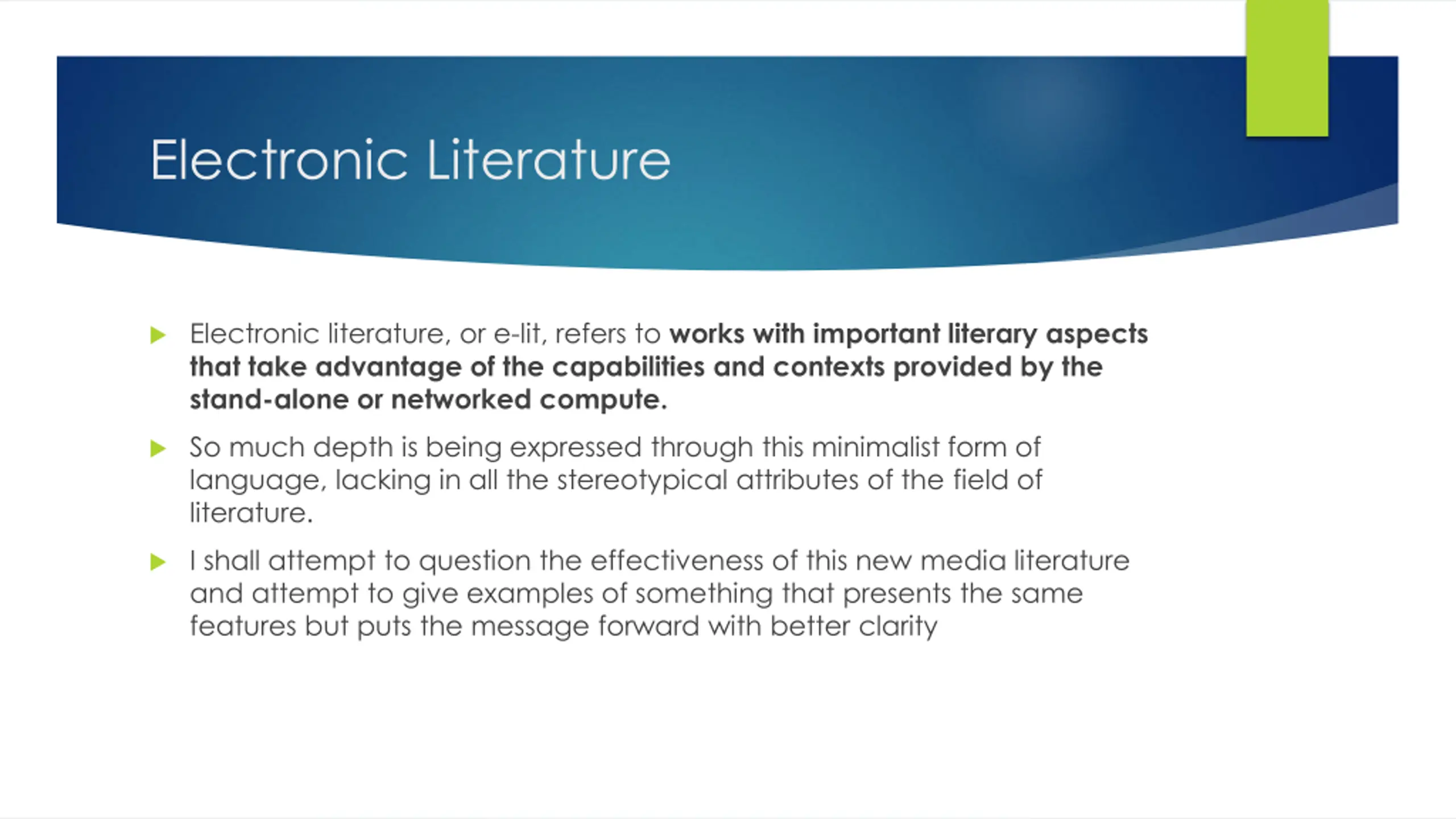 Electronic Literature Electronic literature, or e-lit, refers to works with important literary aspects that take advantage of the capabilities and contexts provided by the stand-alone or networked compute. So much depth is being expressed through this minimalist form of language, lacking in all the stereotypical attributes of the field of literature. I shall attempt to question the effectiveness of this new media literature and attempt to give examples of something that presents the same features but puts the message forward with better clarity