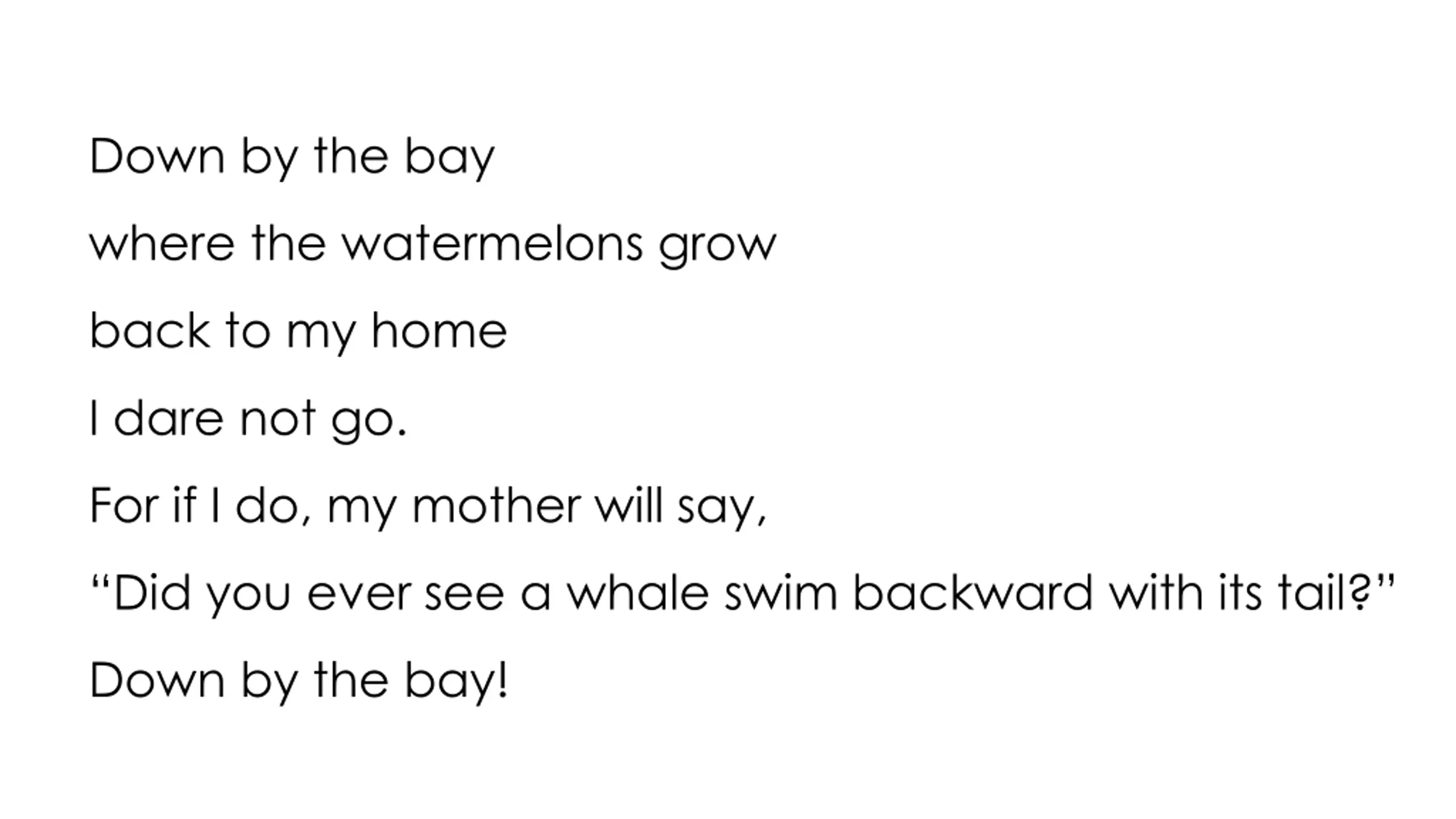 Down by the bay where the watermelons grow back to my home I dare not go. For if I do, my mother will say, Did you ever see a whale swim backward with its tail? Down by the bay!