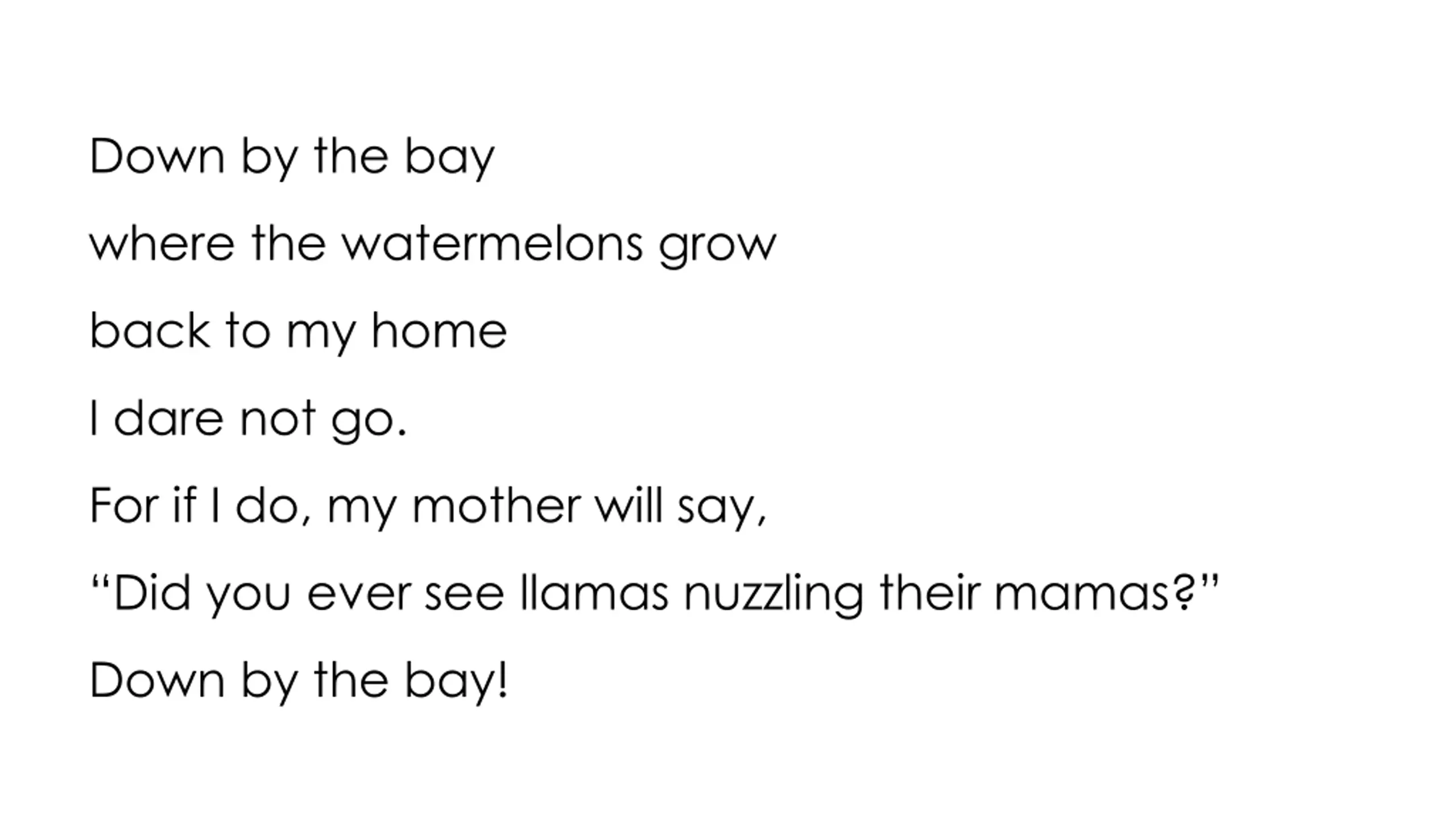 Down by the bay where the watermelons grow back to my home I dare not go. For if I do, my mother will say, Did you ever see llamas nuzzling their mamas? Down by the bay!