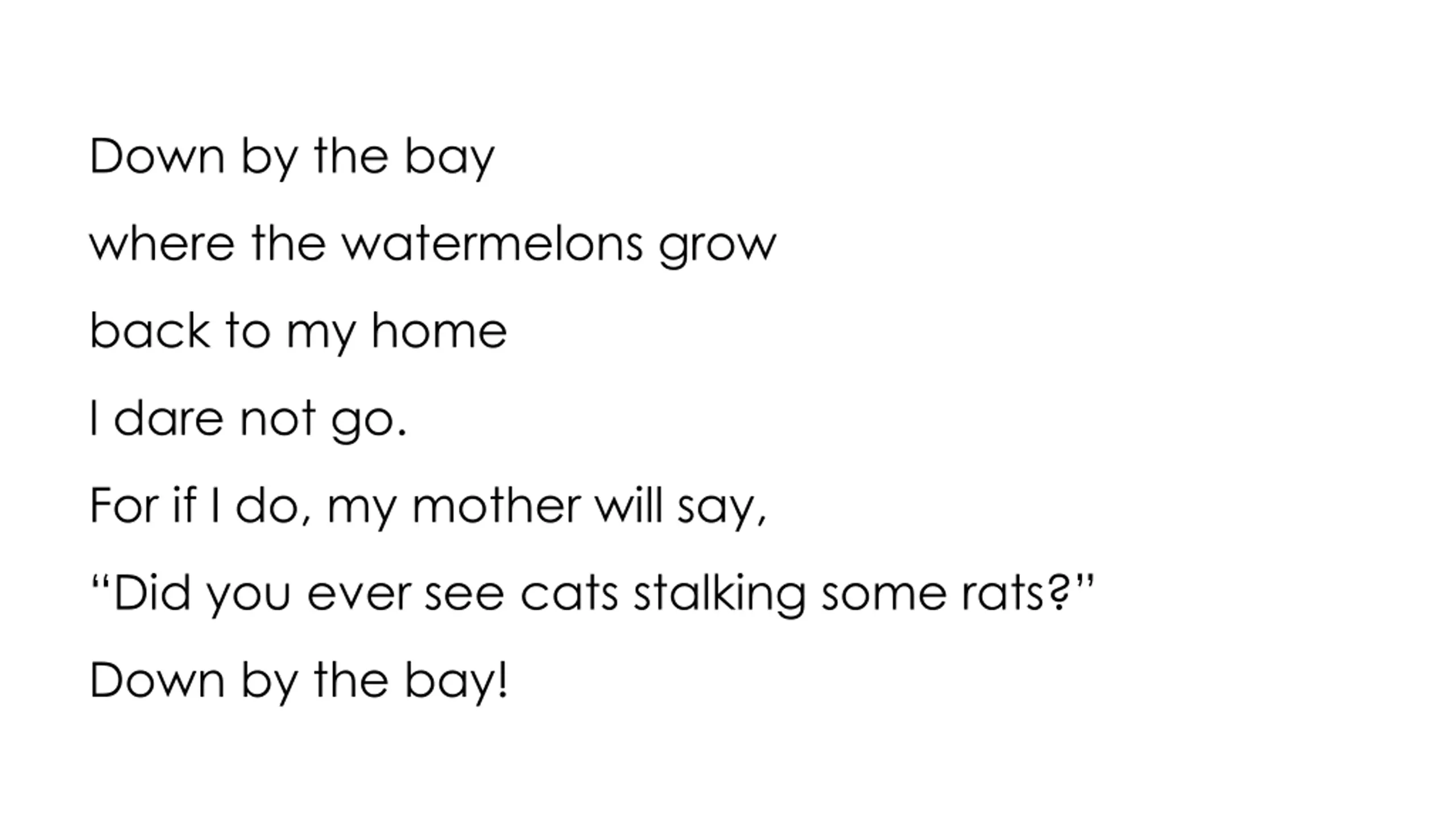 Down by the bay where the watermelons grow back to my home I dare not go. For if I do, my mother will say, Did you ever see cats stalking some rats? Down by the bay!