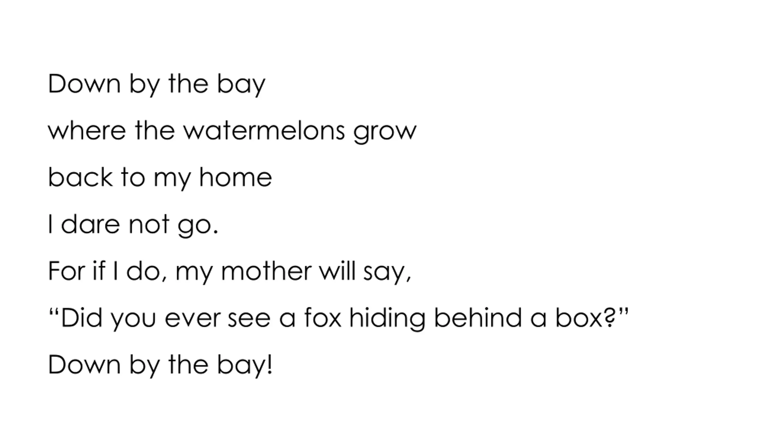 Down by the bay where the watermelons grow back to my home I dare not go. For if I do, my mother will say, Did you ever see a fox hiding behind a box? Down by the bay!