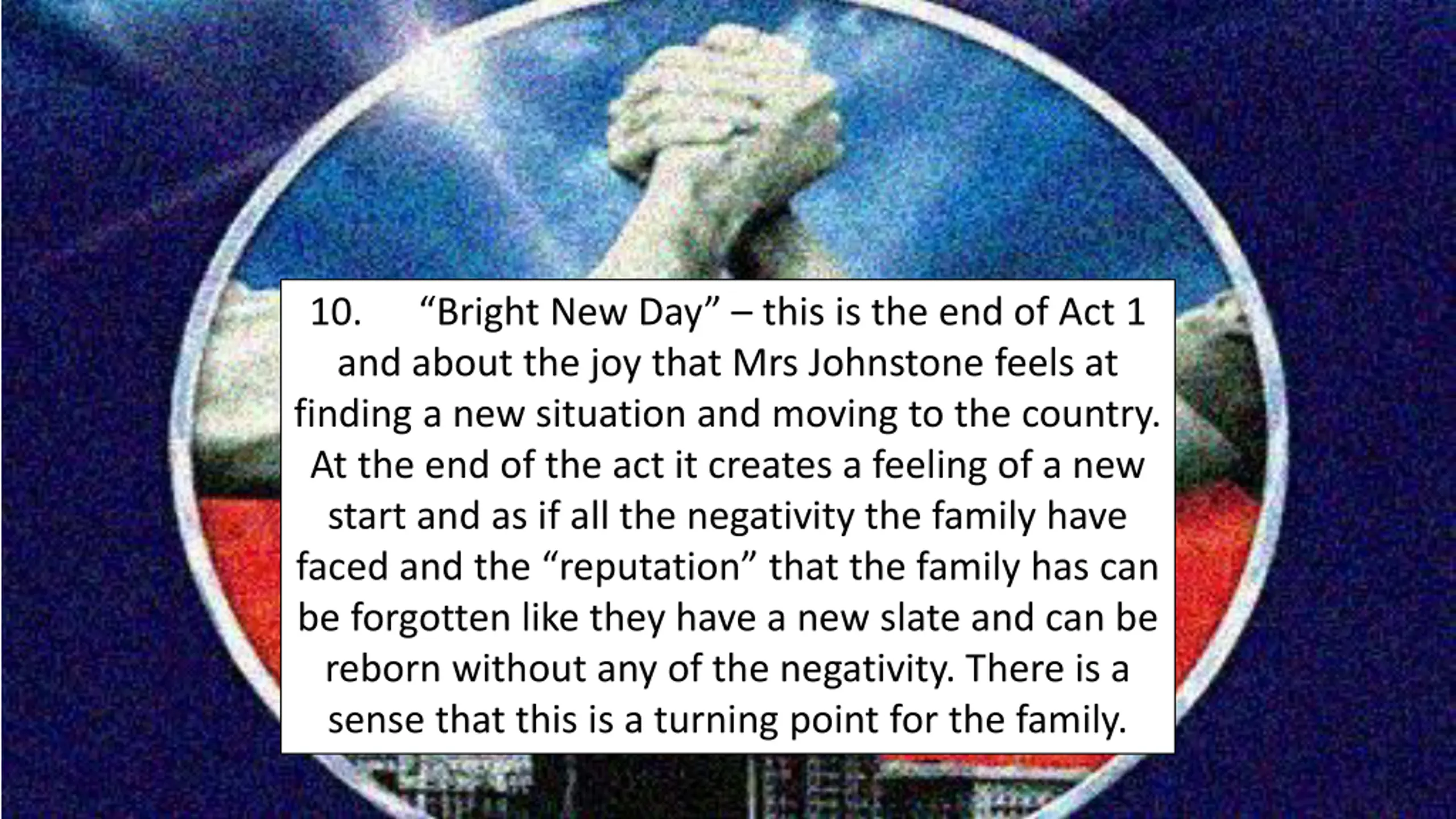 10. and about the joy that Mrs Johnstone feels at finding a new situation and moving to the country. At the end of the act it creates a feeling of a new start and as if all the negativity the family have faced and the reputation that the family has can be forgotten like they have a new slate and can be reborn without any of the negativity. There is a sense that this is a turning point for the family. Bright New Day this is the end of Act 1