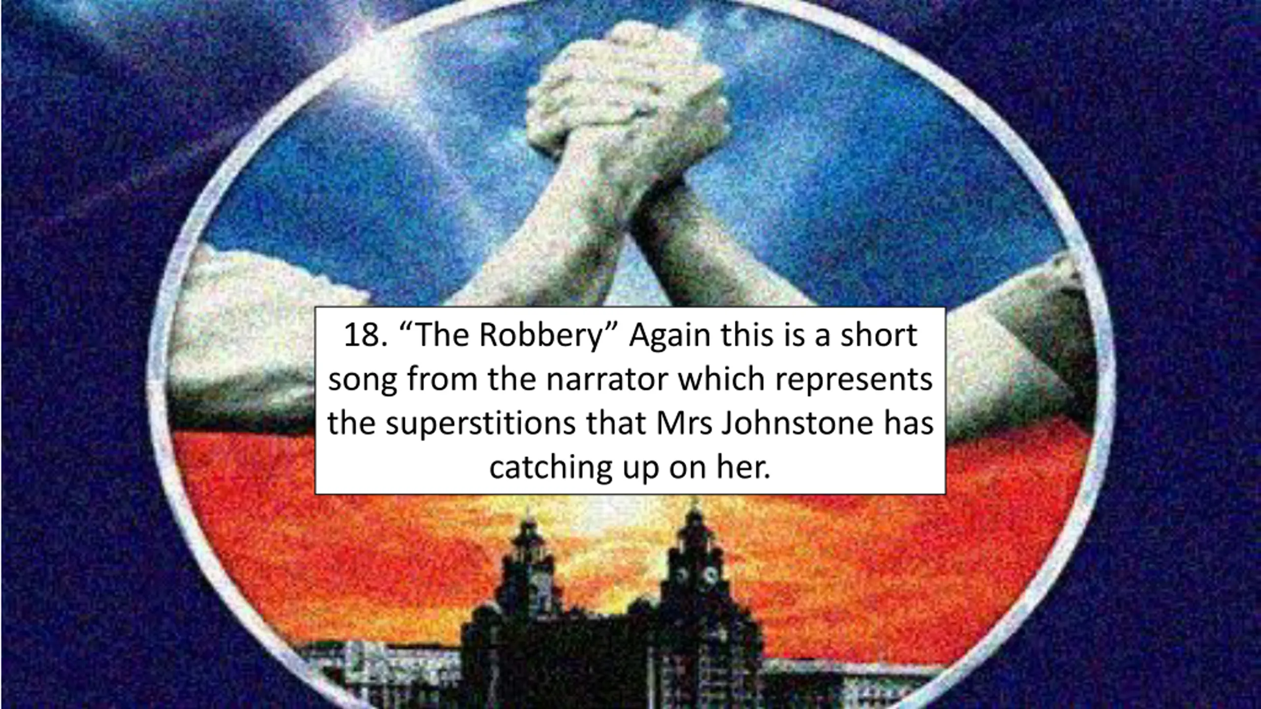 18. The Robbery Again this is a short song from the narrator which represents the superstitions that Mrs Johnstone has catching up on her.
