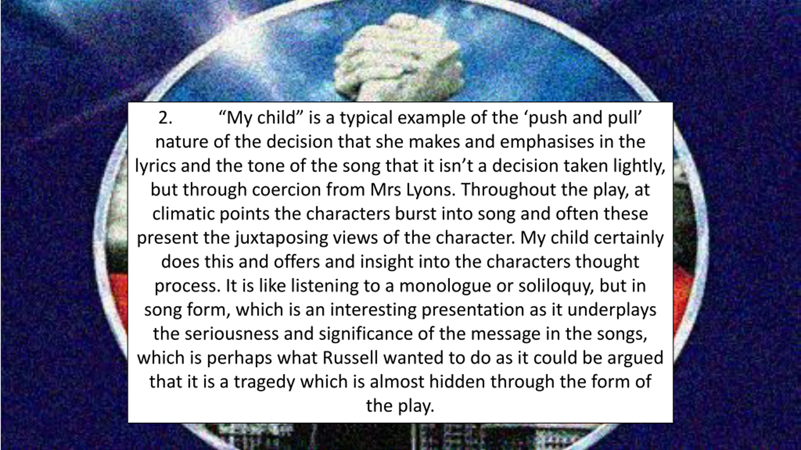 2. nature of the decision that she makes and emphasises in the lyrics and the tone of the song that it isn t a decision taken lightly, but through coercion from Mrs Lyons. Throughout the play, at climatic points the characters burst into song and often these present the juxtaposing views of the character. My child certainly does this and offers and insight into the characters thought process. It is like listening to a monologue or soliloquy, but in song form, which is an interesting presentation as it underplays the seriousness and significance of the message in the songs, which is perhaps what Russell wanted to do as it could be argued that it is a tragedy which is almost hidden through the form of the play. My child is a typical example of the push and pull