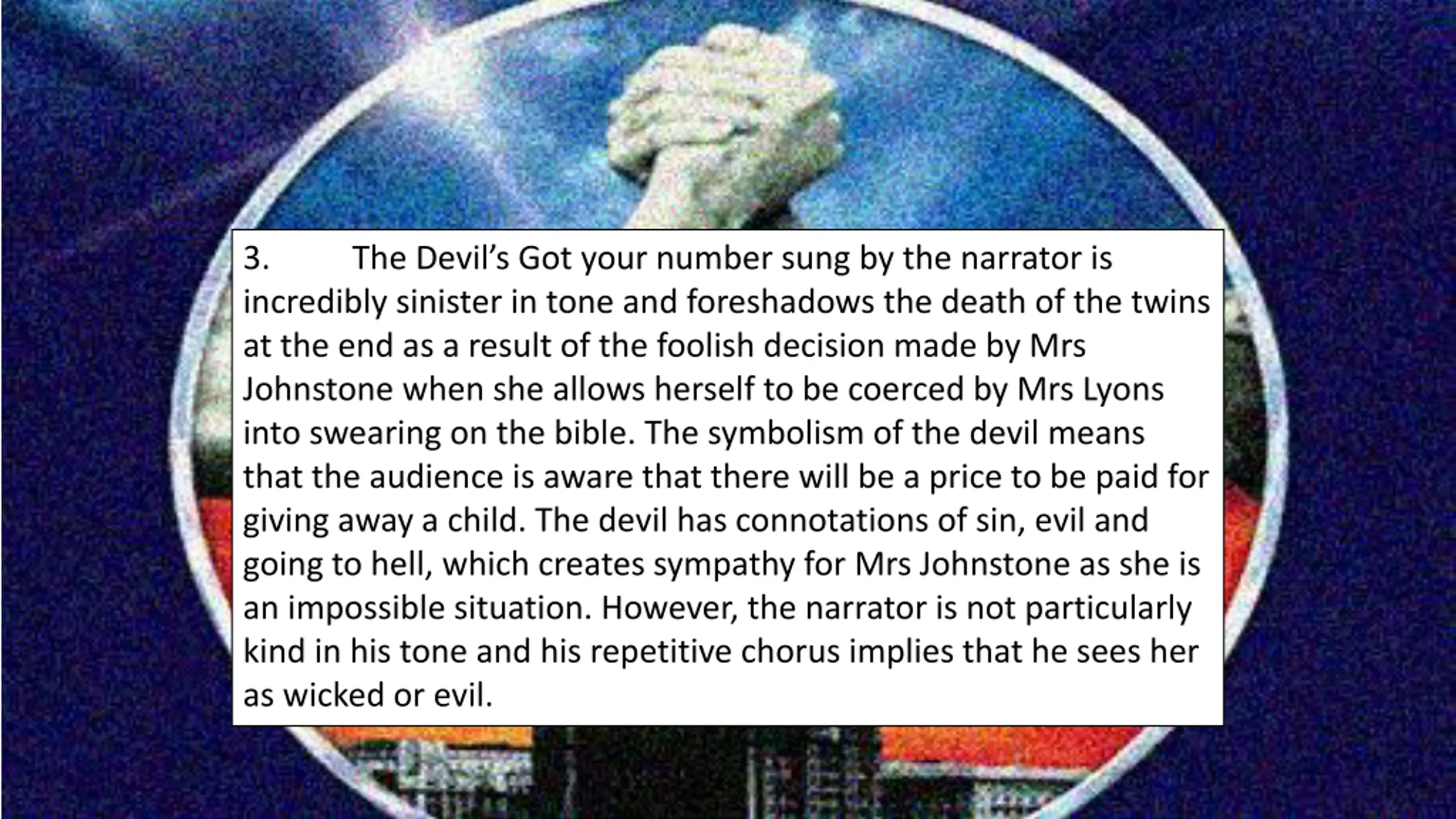 3. incredibly sinister in tone and foreshadows the death of the twins at the end as a result of the foolish decision made by Mrs Johnstone when she allows herself to be coerced by Mrs Lyons into swearing on the bible. The symbolism of the devil means that the audience is aware that there will be a price to be paid for giving away a child. The devil has connotations of sin, evil and going to hell, which creates sympathy for Mrs Johnstone as she is an impossible situation. However, the narrator is not particularly kind in his tone and his repetitive chorus implies that he sees her as wicked or evil. The Devil s Got your number sung by the narrator is