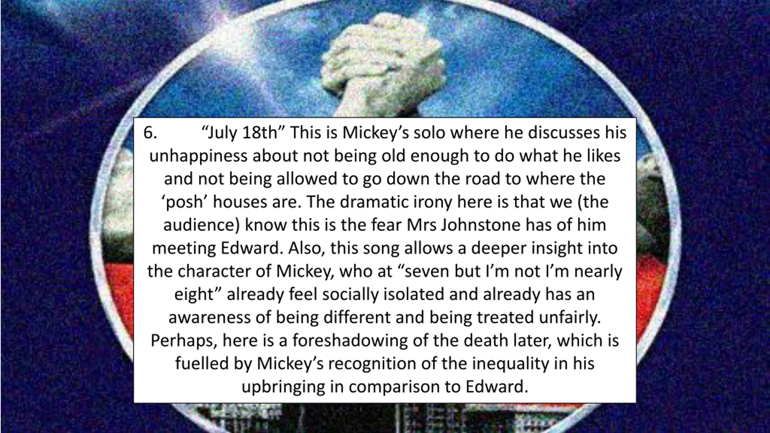 6. unhappiness about not being old enough to do what he likes and not being allowed to go down the road to where the posh houses are. The dramatic irony here is that we (the audience) know this is the fear Mrs Johnstone has of him meeting Edward. Also, this song allows a deeper insight into the character of Mickey, who at seven but I m not I m nearly eight already feel socially isolated and already has an awareness of being different and being treated unfairly. Perhaps, here is a foreshadowing of the death later, which is fuelled by Mickey s recognition of the inequality in his upbringing in comparison to Edward. July 18th This is Mickey s solo where he discusses his