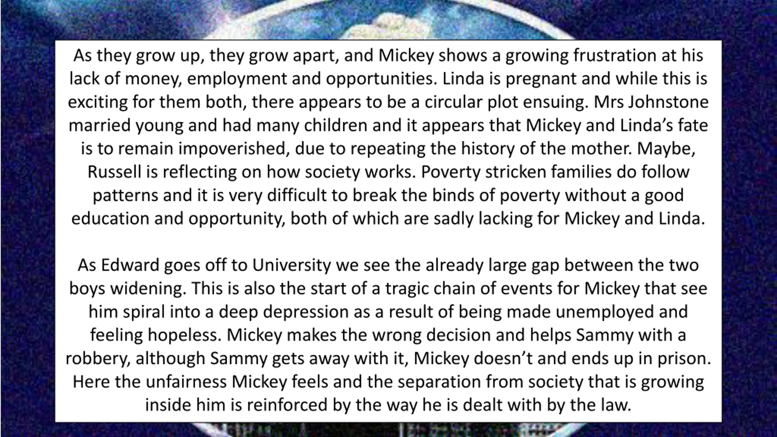 As they grow up, they grow apart, and Mickey shows a growing frustration at his lack of money, employment and opportunities. Linda is pregnant and while this is exciting for them both, there appears to be a circular plot ensuing. Mrs Johnstone married young and had many children and it appears that Mickey and Linda s fate is to remain impoverished, due to repeating the history of the mother. Maybe, Russell is reflecting on how society works. Poverty stricken families do follow patterns and it is very difficult to break the binds of poverty without a good education and opportunity, both of which are sadly lacking for Mickey and Linda. As Edward goes off to University we see the already large gap between the two boys widening. This is also the start of a tragic chain of events for Mickey that see him spiral into a deep depression as a result of being made unemployed and feeling hopeless. Mickey makes the wrong decision and helps Sammy with a robbery, although Sammy gets away with it, Mickey doesn t and ends up in prison. Here the unfairness Mickey feels and the separation from society that is growing inside him is reinforced by the way he is dealt with by the law.