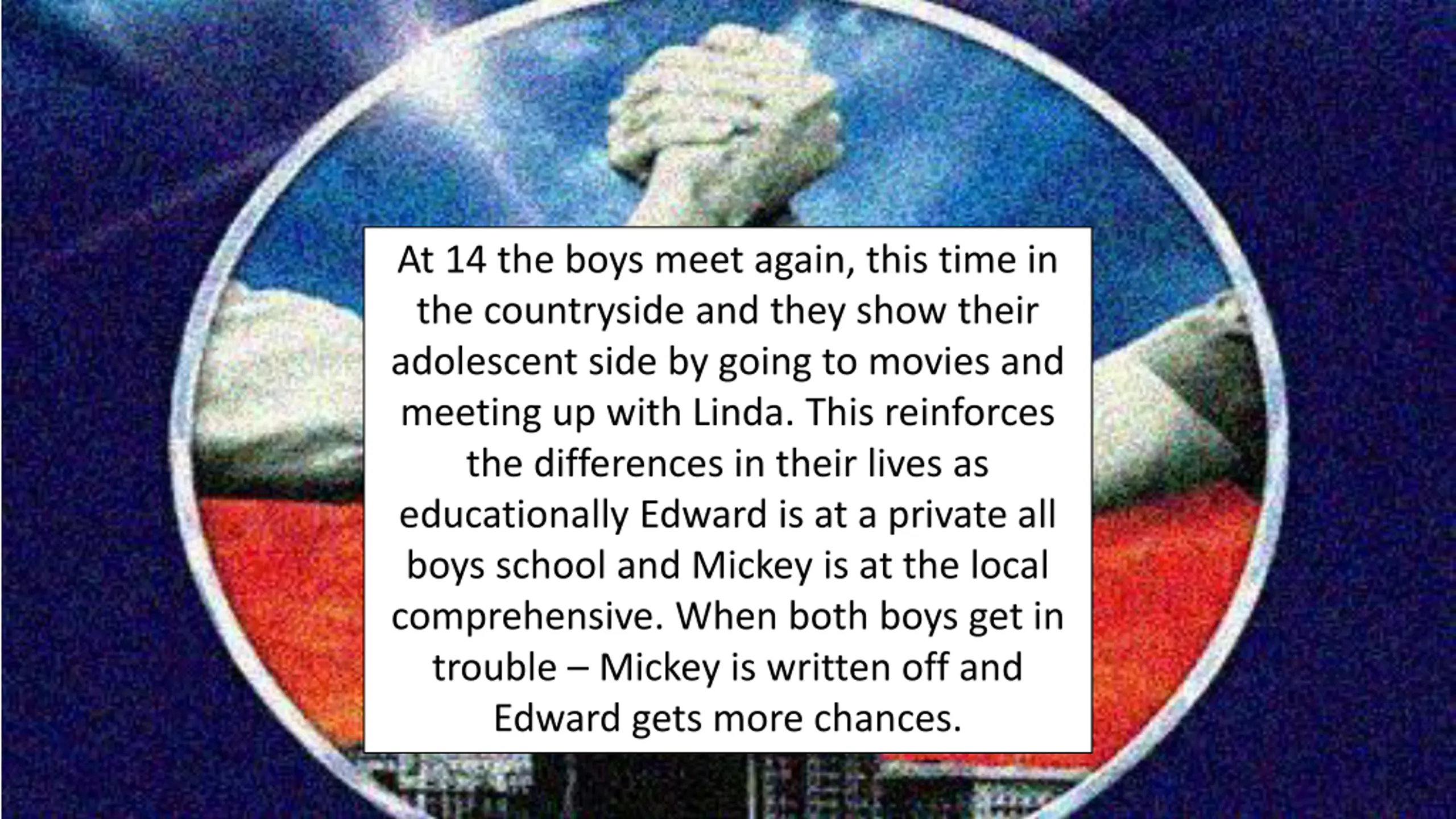 At 14 the boys meet again, this time in the countryside and they show their adolescent side by going to movies and meeting up with Linda. This reinforces the differences in their lives as educationally Edward is at a private all boys school and Mickey is at the local comprehensive. When both boys get in trouble Mickey is written off and Edward gets more chances.
