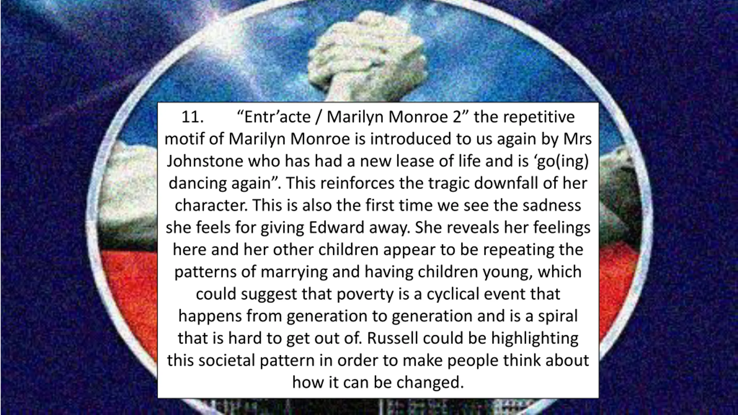 Entracte / Marilyn Monroe 2 the repetitive motif of Marilyn Monroe is introduced to us again by Mrs Johnstone who has had a new lease of life and is go(ing) dancing again . This reinforces the tragic downfall of her character. This is also the first time we see the sadness she feels for giving Edward away. She reveals her feelings here and her other children appear to be repeating the patterns of marrying and having children young, which could suggest that poverty is a cyclical event that happens from generation to generation and is a spiral that is hard to get out of. Russell could be highlighting this societal pattern in order to make people think about how it can be changed. 11.
