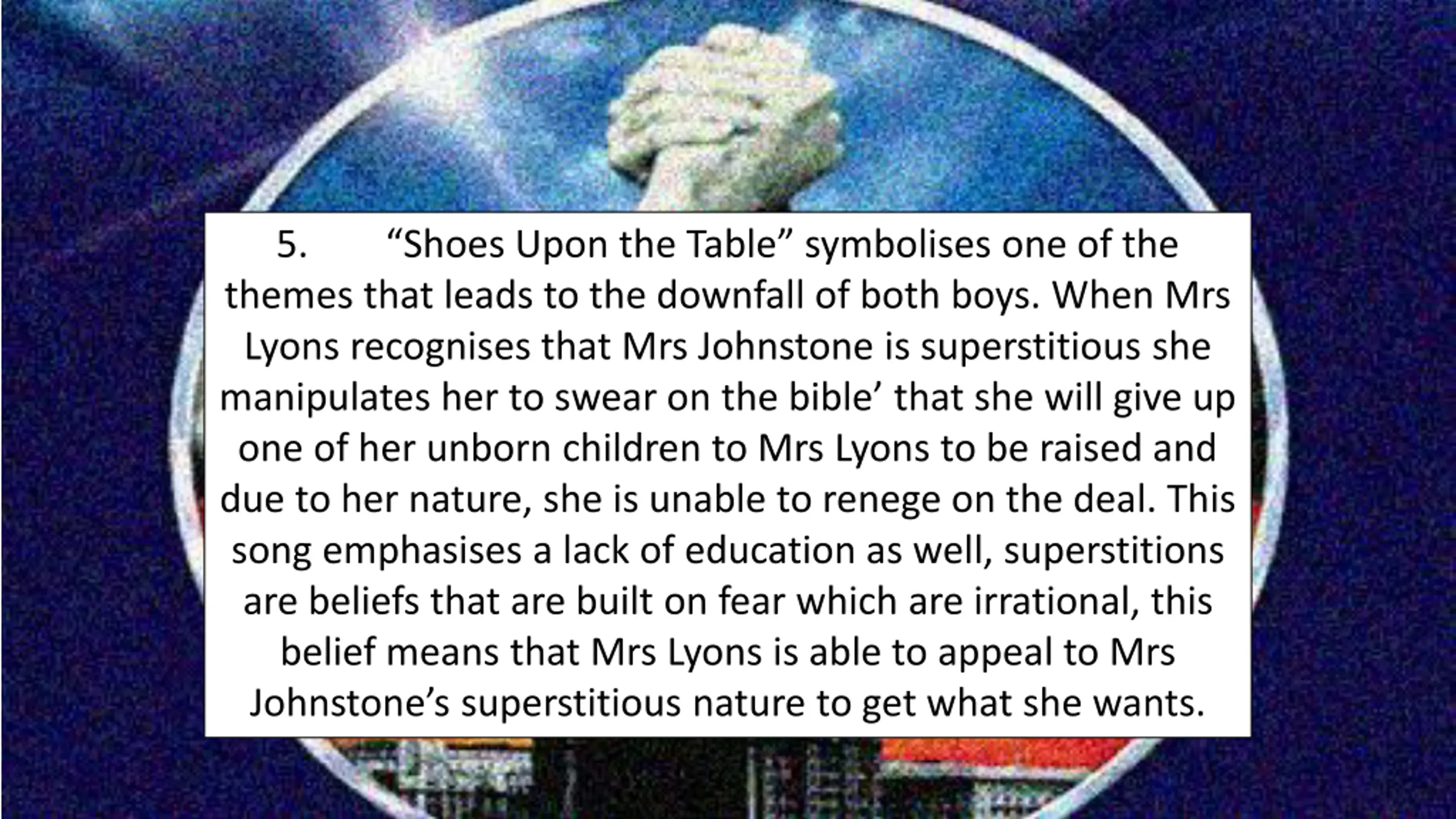 Shoes Upon the Table symbolises one of the themes that leads to the downfall of both boys. When Mrs Lyons recognises that Mrs Johnstone is superstitious she manipulates her to swear on the bible that she will give up one of her unborn children to Mrs Lyons to be raised and due to her nature, she is unable to renege on the deal. This song emphasises a lack of education as well, superstitions are beliefs that are built on fear which are irrational, this belief means that Mrs Lyons is able to appeal to Mrs Johnstone s superstitious nature to get what she wants. 5.