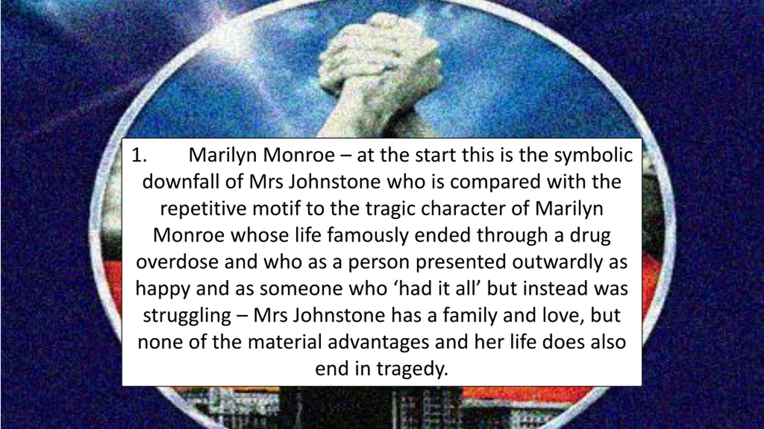 1. Marilyn Monroe at the start this is the symbolic downfall of Mrs Johnstone who is compared with the repetitive motif to the tragic character of Marilyn Monroe whose life famously ended through a drug overdose and who as a person presented outwardly as happy and as someone who had it all but instead was struggling Mrs Johnstone has a family and love, but none of the material advantages and her life does also end in tragedy.