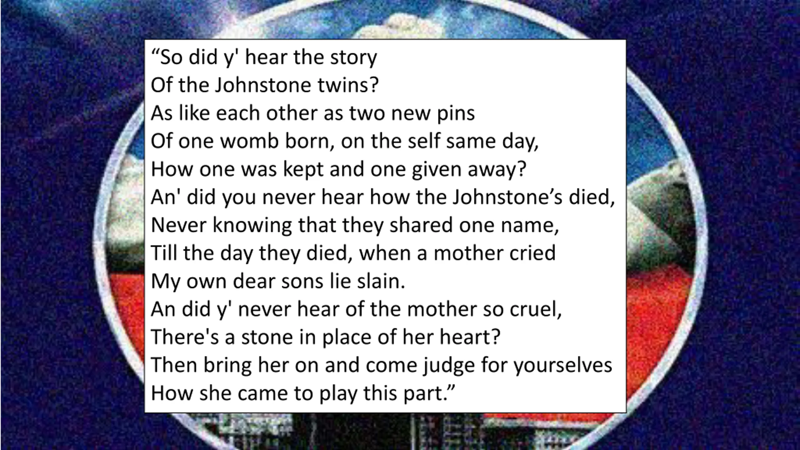 So did y' hear the story Of the Johnstone twins? As like each other as two new pins Of one womb born, on the self same day, How one was kept and one given away? An' did you never hear how the Johnstone s died, Never knowing that they shared one name, Till the day they died, when a mother cried My own dear sons lie slain. An did y' never hear of the mother so cruel, There's a stone in place of her heart? Then bring her on and come judge for yourselves How she came to play this part.