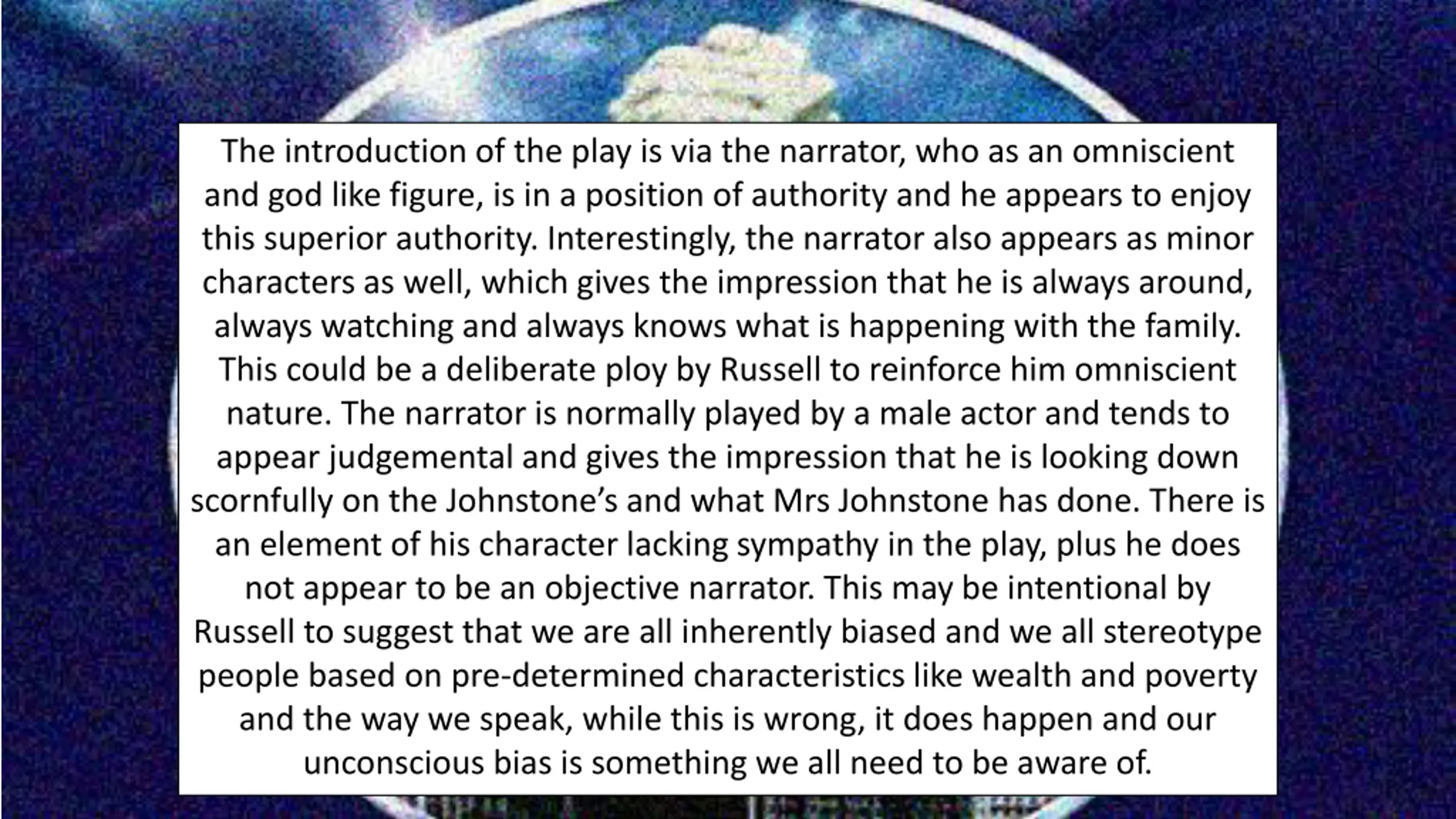 The introduction of the play is via the narrator, who as an omniscient and god like figure, is in a position of authority and he appears to enjoy this superior authority. Interestingly, the narrator also appears as minor characters as well, which gives the impression that he is always around, always watching and always knows what is happening with the family. This could be a deliberate ploy by Russell to reinforce him omniscient nature. The narrator is normally played by a male actor and tends to appear judgemental and gives the impression that he is looking down scornfully on the Johnstone s and what Mrs Johnstone has done. There is an element of his character lacking sympathy in the play, plus he does not appear to be an objective narrator. This may be intentional by Russell to suggest that we are all inherently biased and we all stereotype people based on pre-determined characteristics like wealth and poverty and the way we speak, while this is wrong, it does happen and our unconscious bias is something we all need to be aware of.