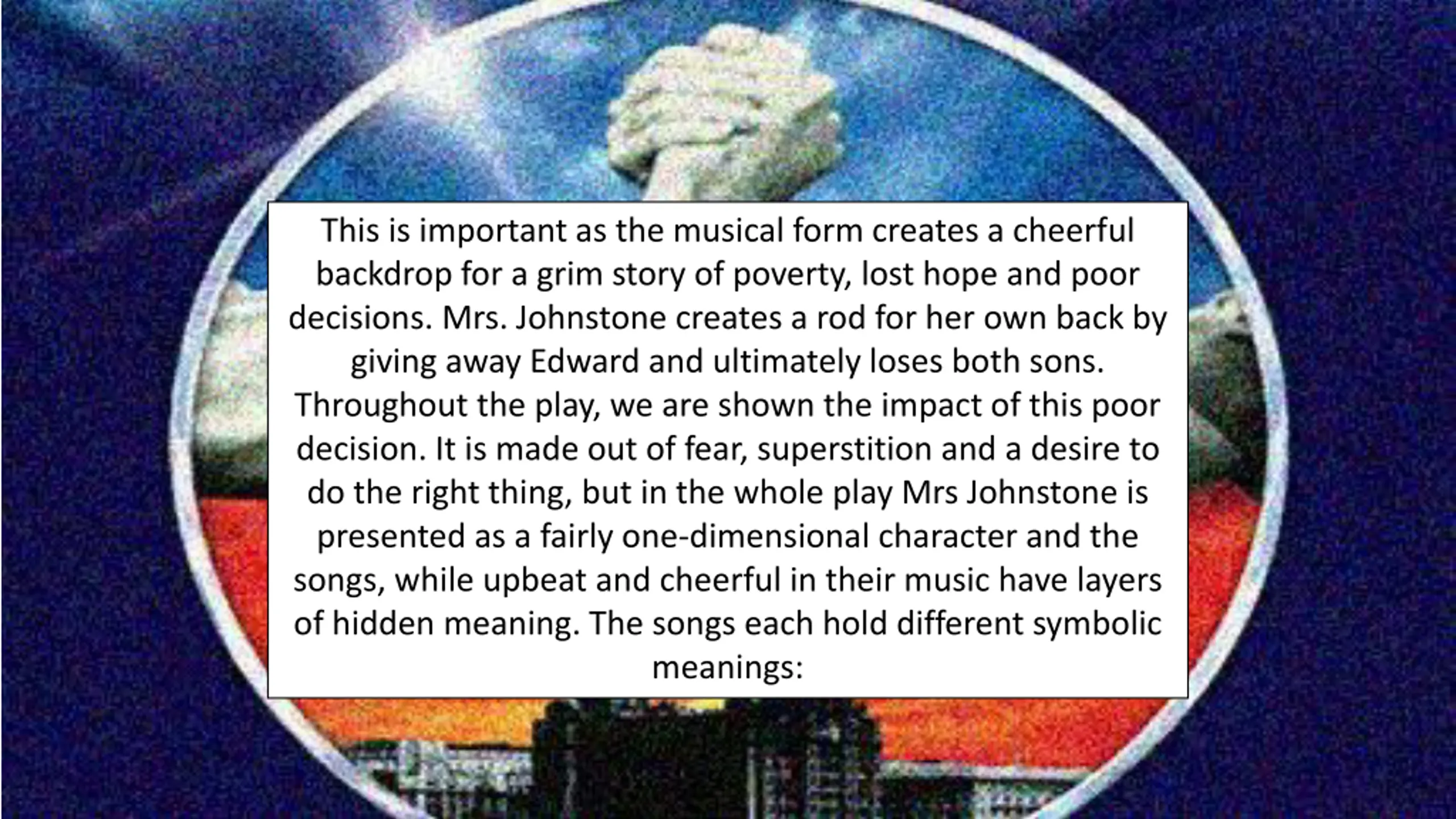 This is important as the musical form creates a cheerful backdrop for a grim story of poverty, lost hope and poor decisions. Mrs. Johnstone creates a rod for her own back by giving away Edward and ultimately loses both sons. Throughout the play, we are shown the impact of this poor decision. It is made out of fear, superstition and a desire to do the right thing, but in the whole play Mrs Johnstone is presented as a fairly one-dimensional character and the songs, while upbeat and cheerful in their music have layers of hidden meaning. The songs each hold different symbolic meanings:
