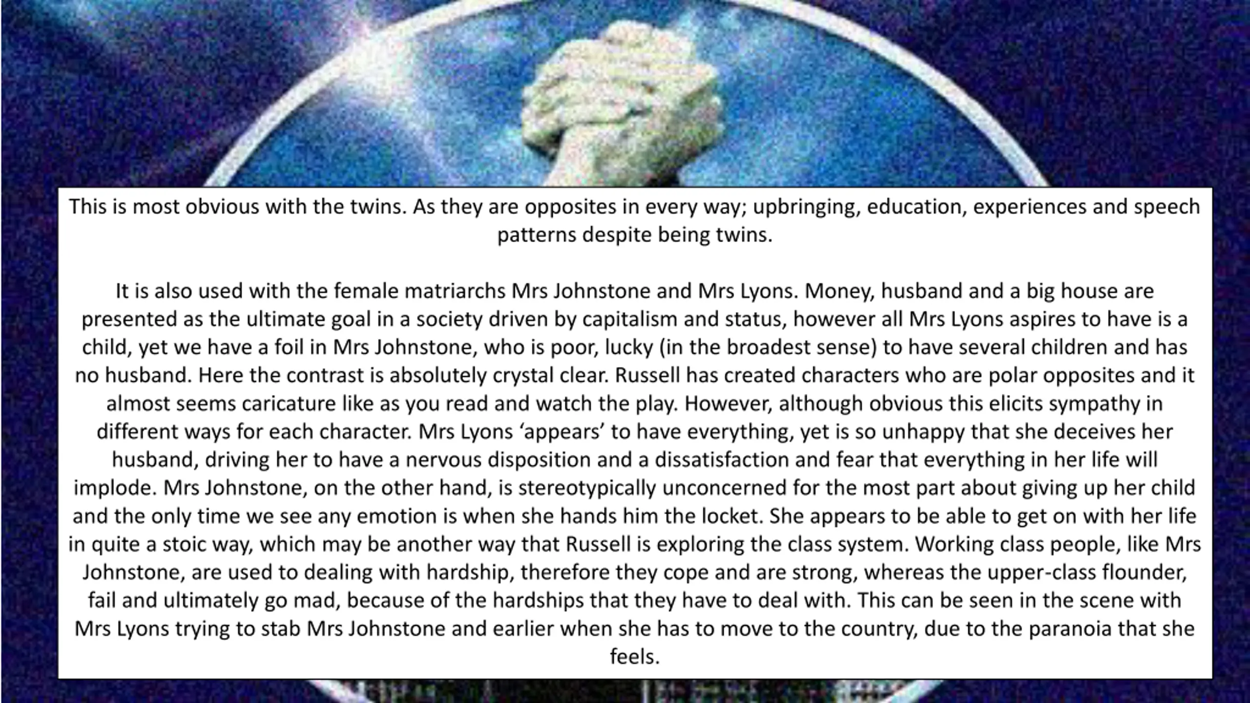 This is most obvious with the twins. As they are opposites in every way; upbringing, education, experiences and speech patterns despite being twins. It is also used with the female matriarchs Mrs Johnstone and Mrs Lyons. Money, husband and a big house are presented as the ultimate goal in a society driven by capitalism and status, however all Mrs Lyons aspires to have is a child, yet we have a foil in Mrs Johnstone, who is poor, lucky (in the broadest sense) to have several children and has no husband. Here the contrast is absolutely crystal clear. Russell has created characters who are polar opposites and it almost seems caricature like as you read and watch the play. However, although obvious this elicits sympathy in different ways for each character. Mrs Lyons appears to have everything, yet is so unhappy that she deceives her husband, driving her to have a nervous disposition and a dissatisfaction and fear that everything in her life will implode. Mrs Johnstone, on the other hand, is stereotypically unconcerned for the most part about giving up her child and the only time we see any emotion is when she hands him the locket. She appears to be able to get on with her life in quite a stoic way, which may be another way that Russell is exploring the class system. Working class people, like Mrs Johnstone, are used to dealing with hardship, therefore they cope and are strong, whereas the upper-class flounder, fail and ultimately go mad, because of the hardships that they have to deal with. This can be seen in the scene with Mrs Lyons trying to stab Mrs Johnstone and earlier when she has to move to the country, due to the paranoia that she feels.