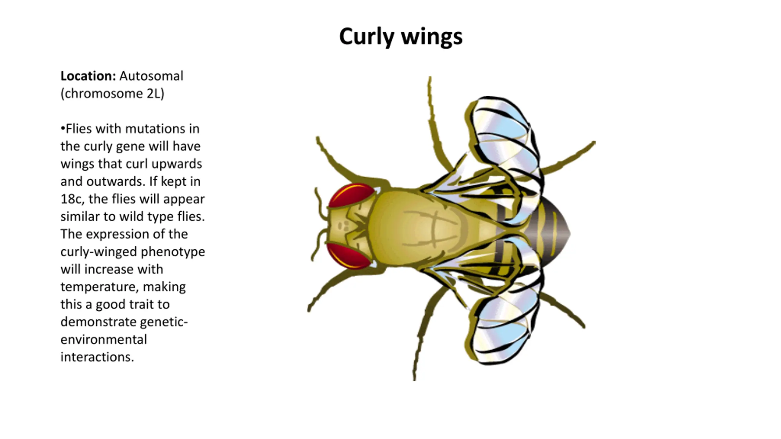 Curly wings Location: Autosomal (chromosome 2L) Flies with mutations in the curly gene will have wings that curl upwards and outwards. If kept in 18c, the flies will appear similar to wild type flies. The expression of the curly-winged phenotype will increase with temperature, making this a good trait to demonstrate genetic- environmental interactions.