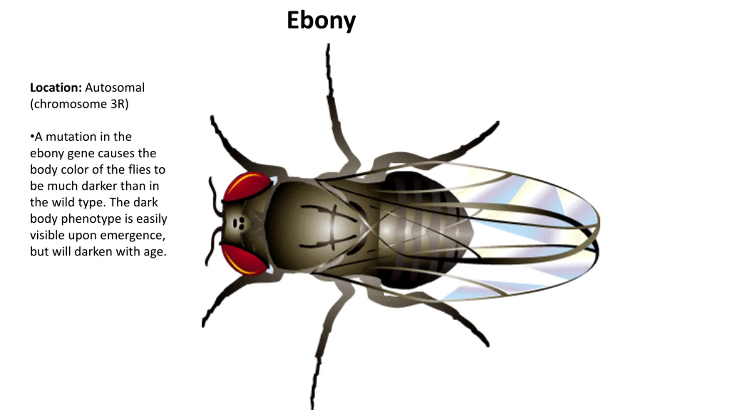 Ebony Location: Autosomal (chromosome 3R) A mutation in the ebony gene causes the body color of the flies to be much darker than in the wild type. The dark body phenotype is easily visible upon emergence, but will darken with age.