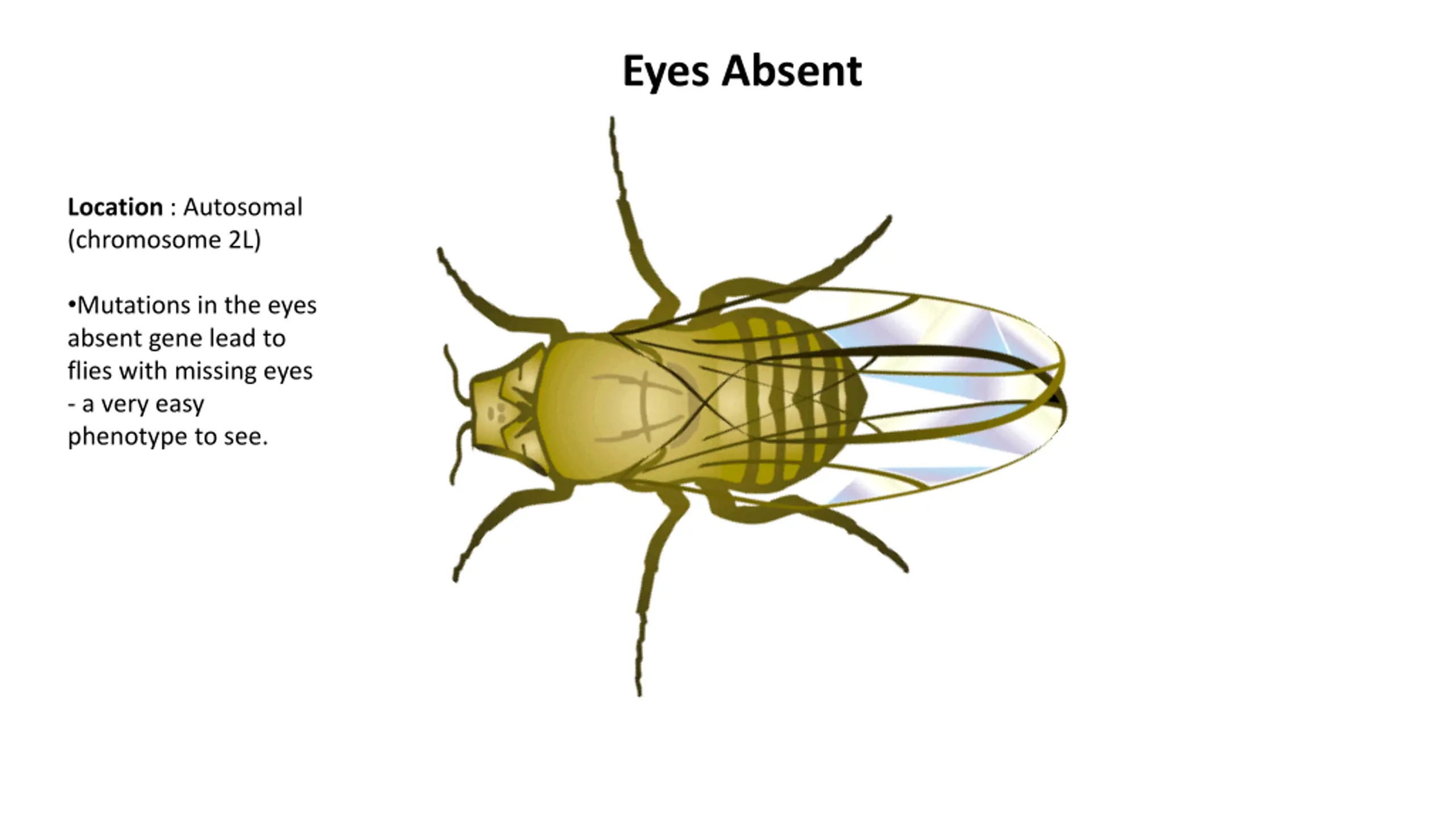 Eyes Absent Location : Autosomal (chromosome 2L) Mutations in the eyes absent gene lead to flies with missing eyes - a very easy phenotype to see.