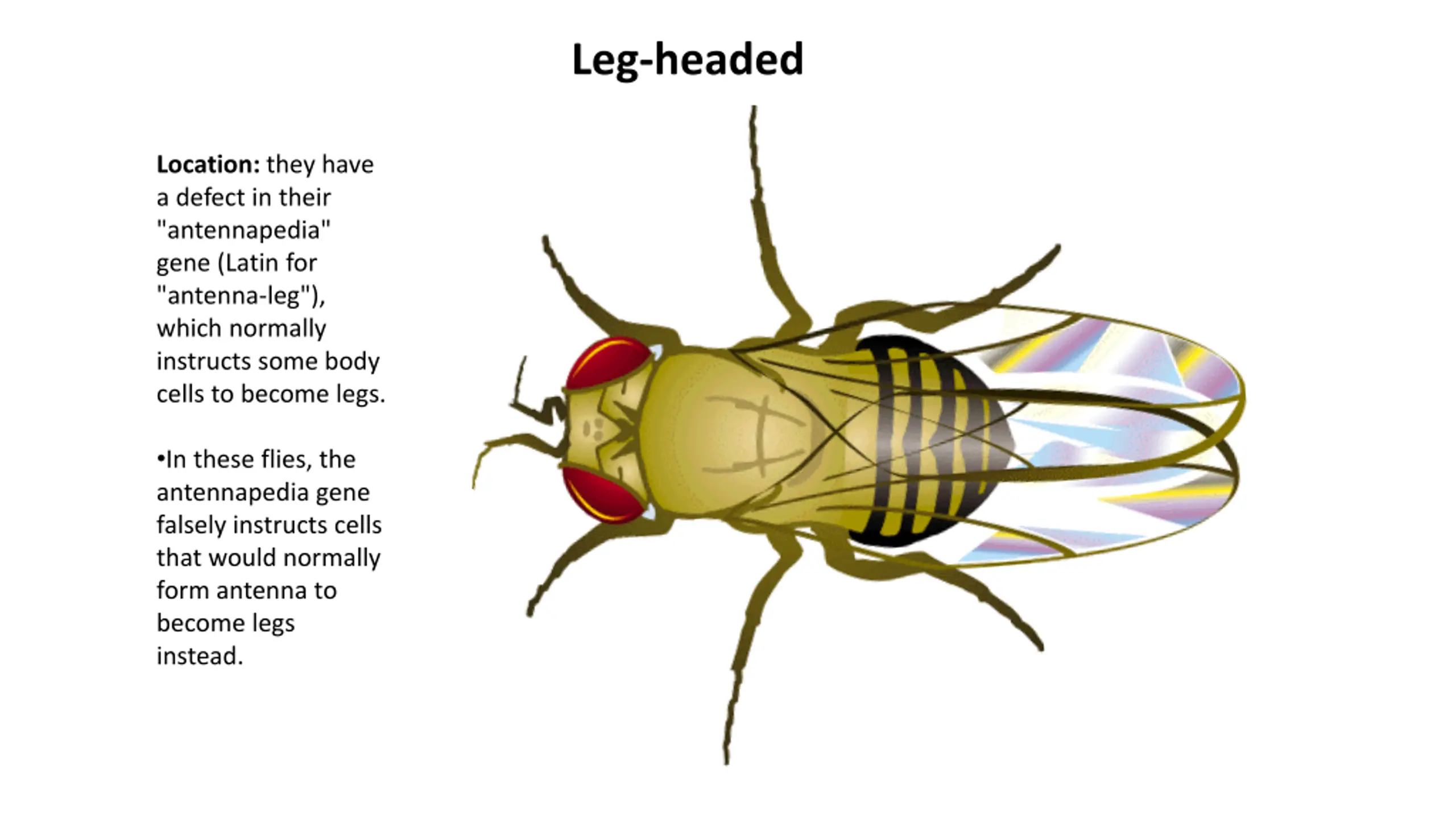 Leg-headed Location: they have a defect in their "antennapedia" gene (Latin for "antenna-leg"), which normally instructs some body cells to become legs. In these flies, the antennapedia gene falsely instructs cells that would normally form antenna to become legs instead.