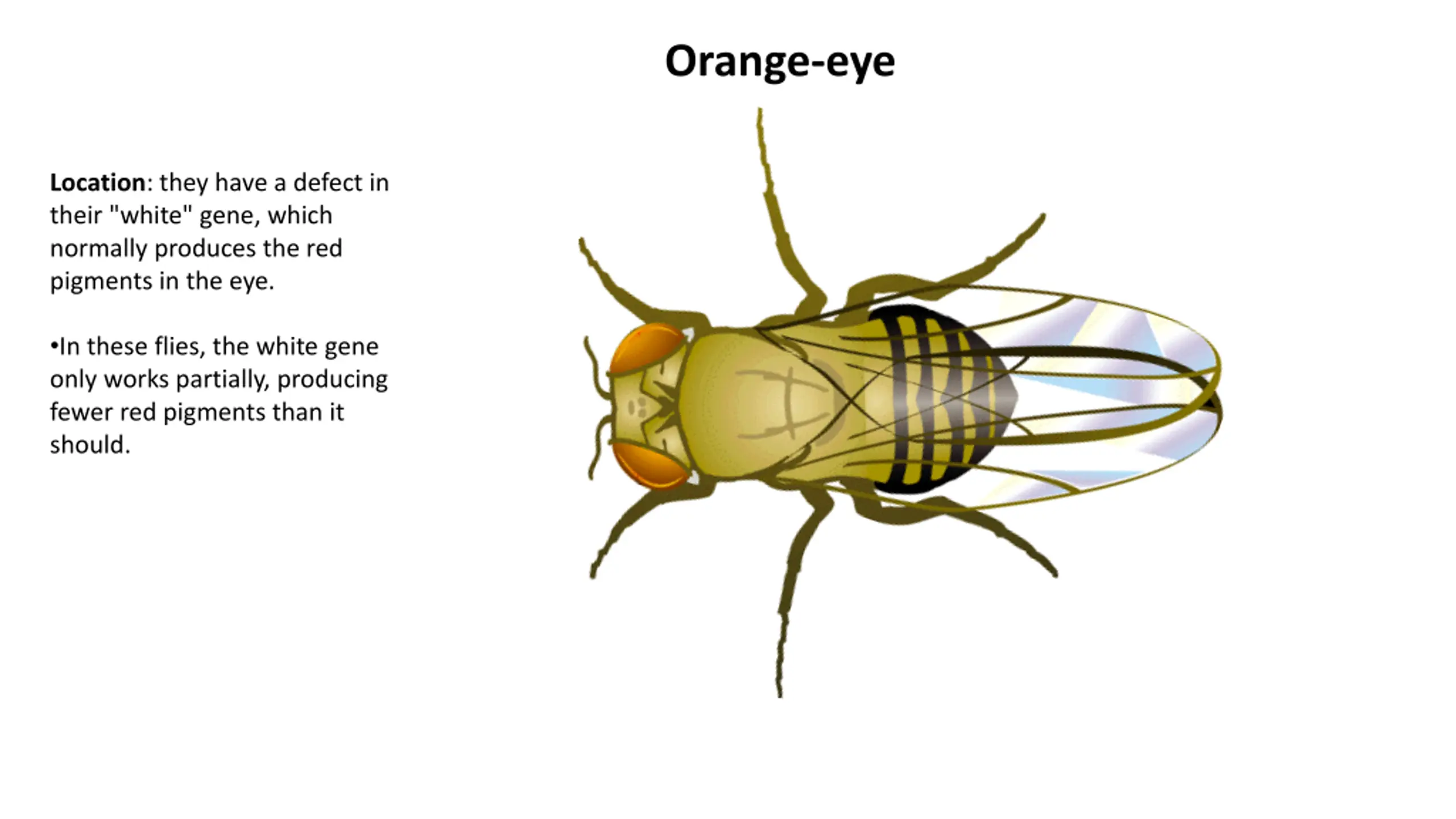 Orange-eye Location: they have a defect in their "white" gene, which normally produces the red pigments in the eye. In these flies, the white gene only works partially, producing fewer red pigments than it should.