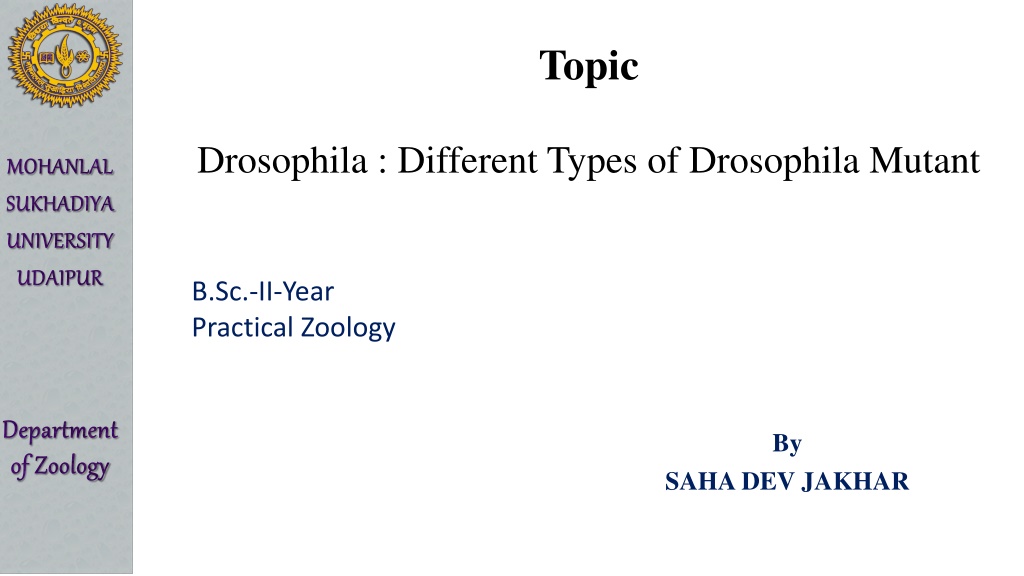Topic Drosophila : Different Types of Drosophila Mutant MOHANLAL MOHANLAL SUKHADIYA SUKHADIYA UNIVERSITY UNIVERSITY UDAIPUR UDAIPUR B.Sc.-II-Year Practical Zoology Department Department of Zoology of Zoology By SAHA DEV JAKHAR