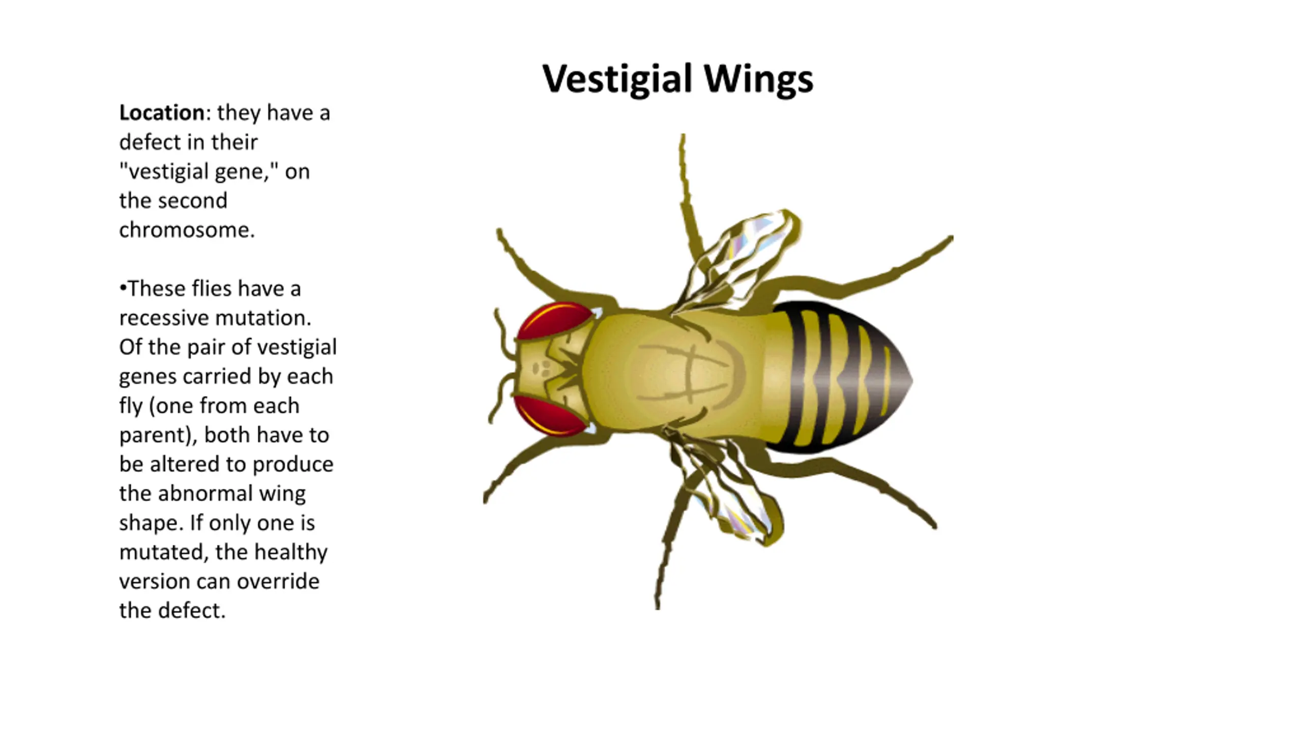 Vestigial Wings Location: they have a defect in their "vestigial gene," on the second chromosome. These flies have a recessive mutation. Of the pair of vestigial genes carried by each fly (one from each parent), both have to be altered to produce the abnormal wing shape. If only one is mutated, the healthy version can override the defect.