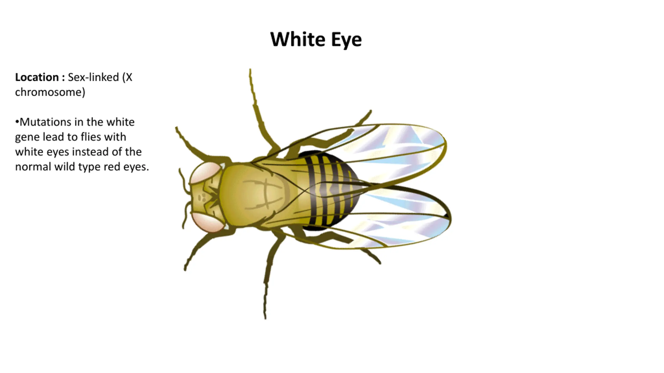 White Eye Location : Sex-linked (X chromosome) Mutations in the white gene lead to flies with white eyes instead of the normal wild type red eyes.