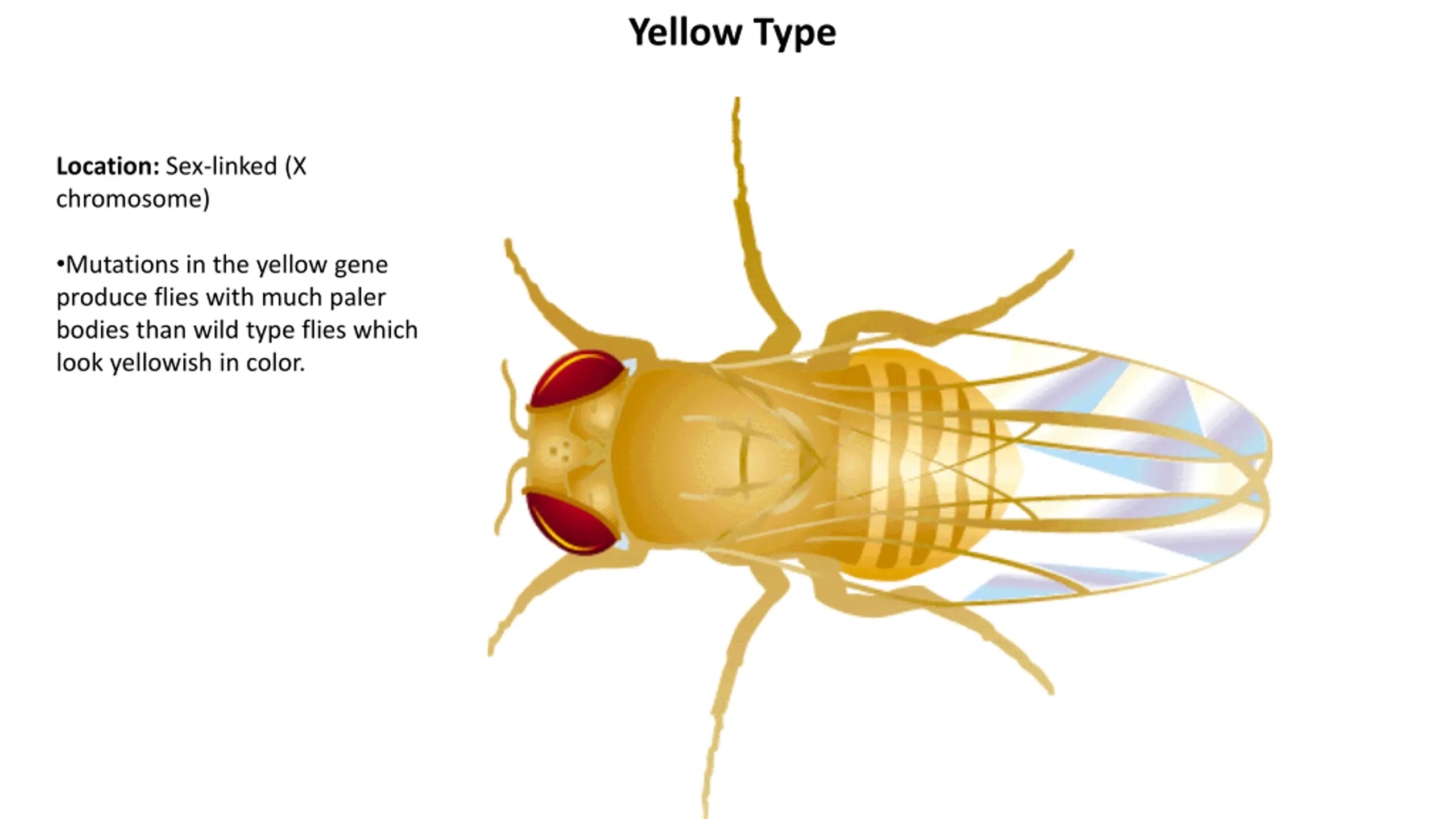 Yellow Type Location: Sex-linked (X chromosome) Mutations in the yellow gene produce flies with much paler bodies than wild type flies which look yellowish in color.