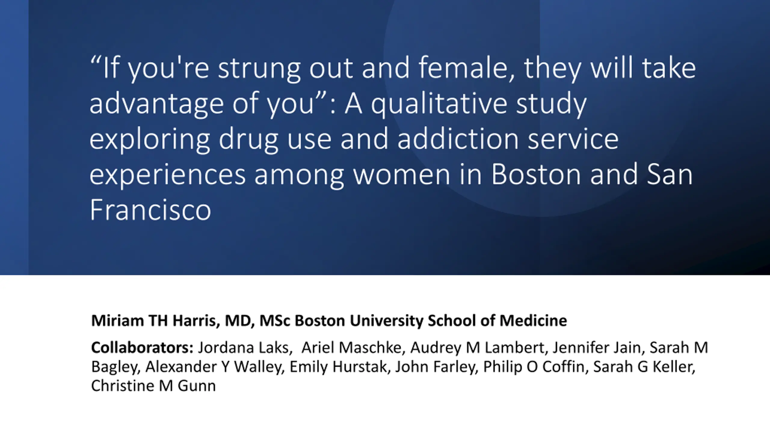 If you're strung out and female, they will take advantage of you : A qualitative study exploring drug use and addiction service experiences among women in Boston and San Francisco Miriam TH Harris, MD, MSc Boston University School of Medicine Collaborators: Jordana Laks, Ariel Maschke, Audrey M Lambert, Jennifer Jain, Sarah M Bagley, Alexander Y Walley, Emily Hurstak, John Farley, Philip O Coffin, Sarah G Keller, Christine M Gunn